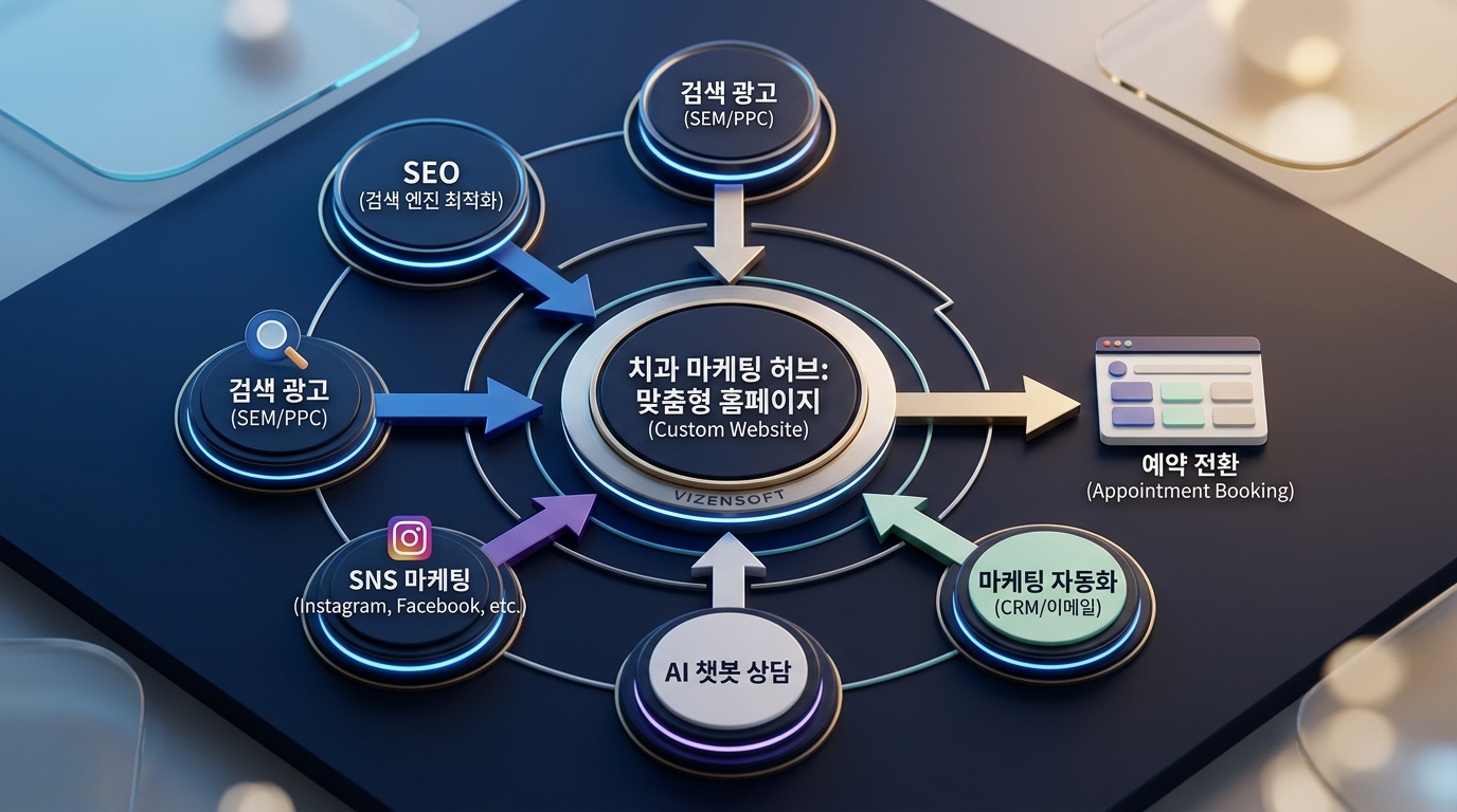 홈페이지 방문부터 예약, 내원, 재방문까지의 여정을 자동화하는 것이 현대 치과 마케팅의 핵심입니다. 홈페이지에서 예약 문의를 남긴 환자에게 자동으로 확인 메시지를 발송하고, 내원 전날 리마인더를 보내며, 치료 후 만족도 조사를 자동 발송하는 시스템을 갖추면 환자 경험이 크게 향상됩니다. 비젠소프트의 마케팅 자동화 시스템이 이러한 환자 커뮤니케이션 자동화를 지원합니다.