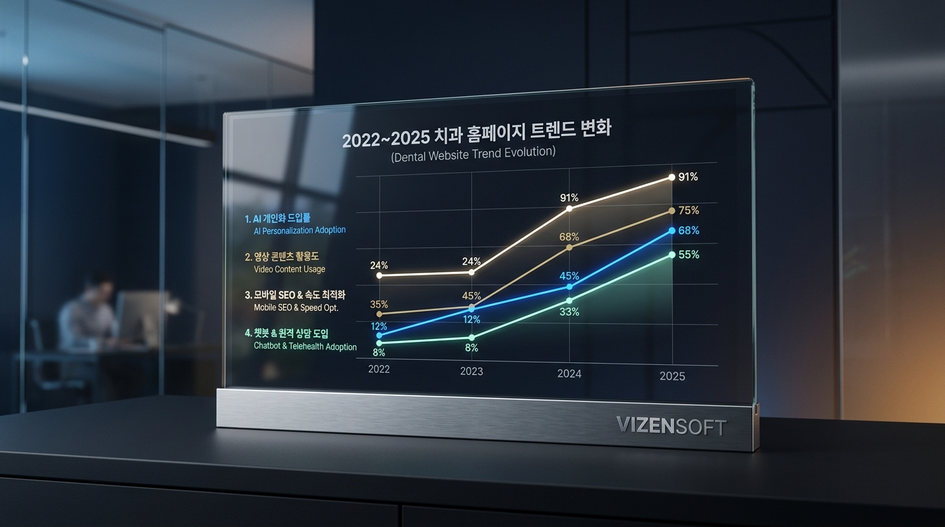치과 웹사이트 업계도 빠르게 변화하고 있습니다. 몇 년 전의 트렌드를 그대로 따라 만든 홈페이지는 이미 구식이 되어버린 경우가 많죠. 최신 트렌드를 파악하고 홈페이지에 적용하는 것이 경쟁 치과보다 한발 앞서 나가는 방법입니다.