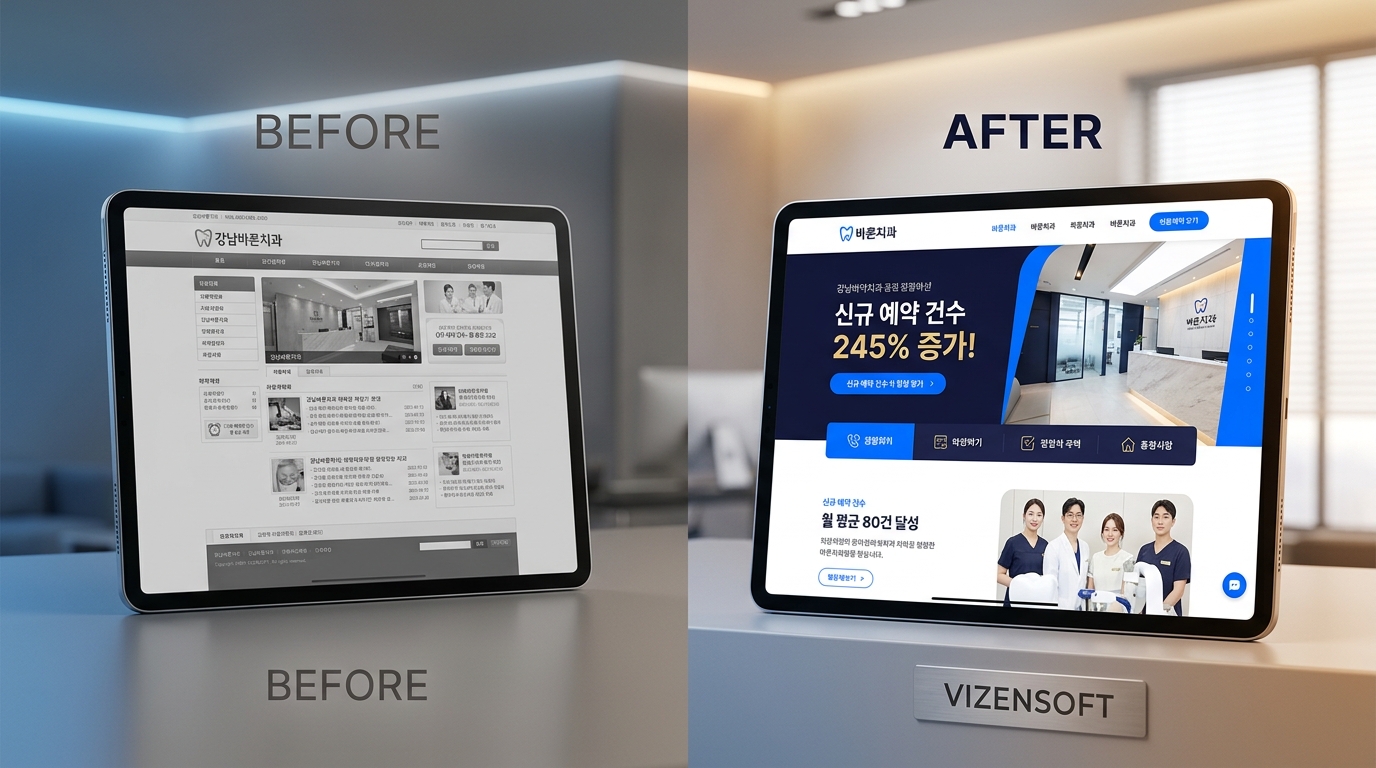 ③ 500만~1,500만 원 구간 - 풀 커스텀 개발 치과의 브랜드 아이덴티티를 완전히 반영한 디자인, SEO 최적화된 구조, 온라인 예약 시스템, 환자 관리 기능, 카카오톡 채널 연동, AI 챗봇 등 마케팅에 필요한 기능을 원하는 대로 구현할 수 있는 구간입니다. 초기 비용이 높아 보이지만, 장기적으로 광고 효율이 높아지고 신규 환자 유입이 지속적으로 증가하므로 ROI(투자 대비 수익률) 측면에서 가장 효율적인 선택입니다. 비젠소프트의 치과 커스텀 홈페이지 개발이 이 구간에 해당하며, 단순 제작을 넘어 마케팅 전략까지 함께 설계합니다.