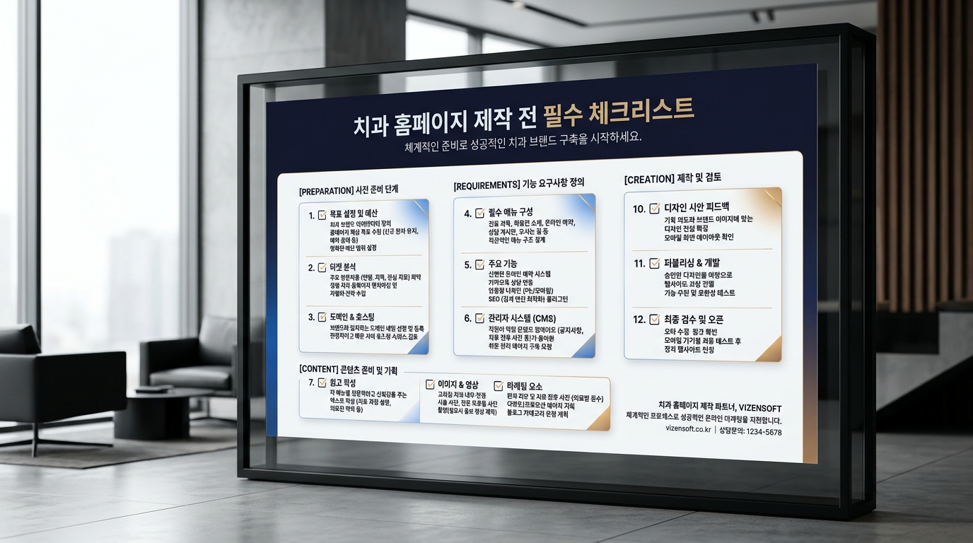 좋은 치과 홈페이지를 만들기 위해 제작 의뢰 전 반드시 확인해야 할 체크리스트를 정리했습니다. 이 리스트를 보고 개발사와 충분히 협의하는 것이 성공적인 홈페이지 제작의 첫 걸음입니다.