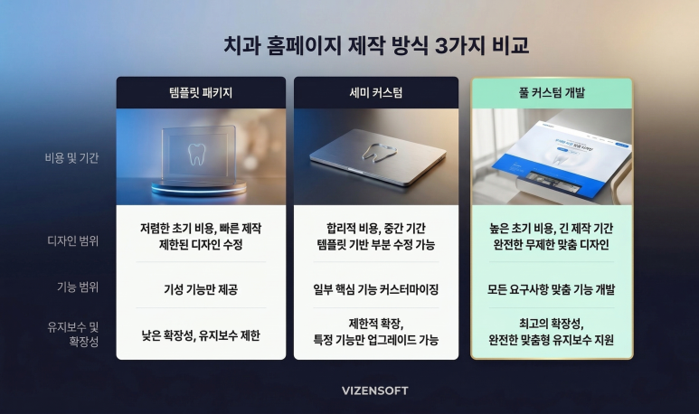 치과 홈페이지를 제작하는 방법은 크게 세 가지입니다. 각 방식의 특징과 장단점을 객관적으로 비교해보겠습니다.