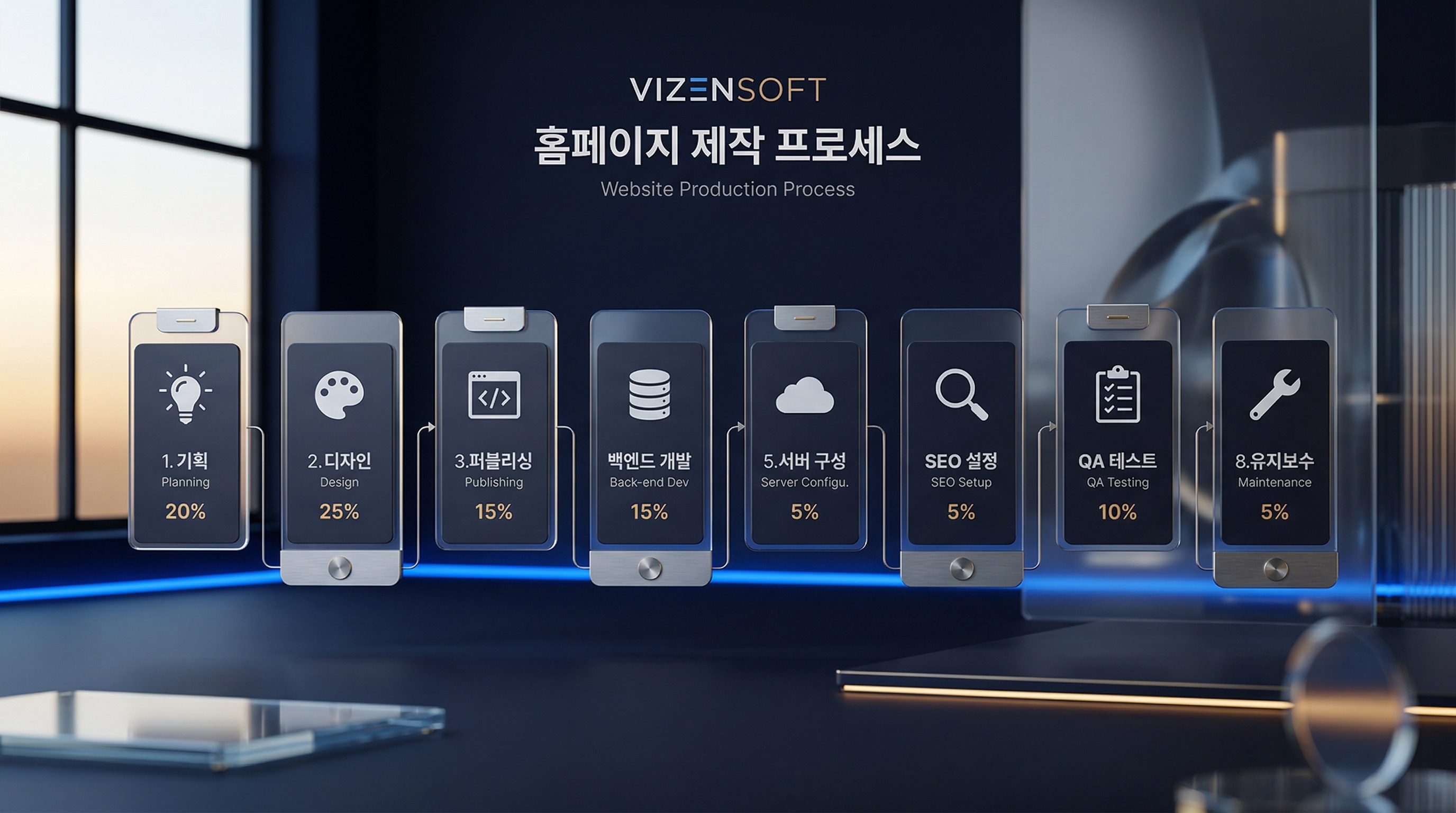 웹사이트 견적을 정확히 이해하려면, 먼저 홈페이지 제작이라는 작업이 어떤 요소들로 구성되는지를 파악해야 합니다. 많은 분들이 홈페이지 제작을 '디자인 작업'으로만 인식하는데, 실제로는 전혀 다릅니다. 홈페이지 하나를 만들기 위해서는 기획, 디자인, 퍼블리싱(HTML/CSS 코딩), 개발(백엔드 프로그래밍), 서버 구성, 도메인 연결, SEO 기초 설정, QA 테스트, 런칭 후 유지보수까지 최소 8단계 이상의 전문 작업이 필요합니다.