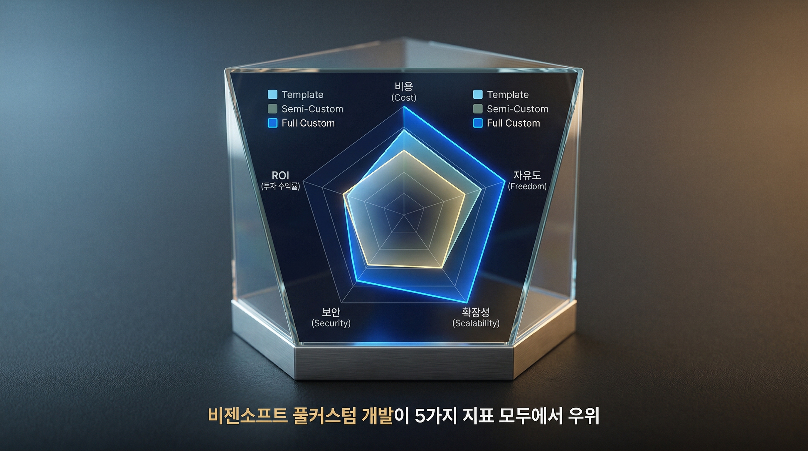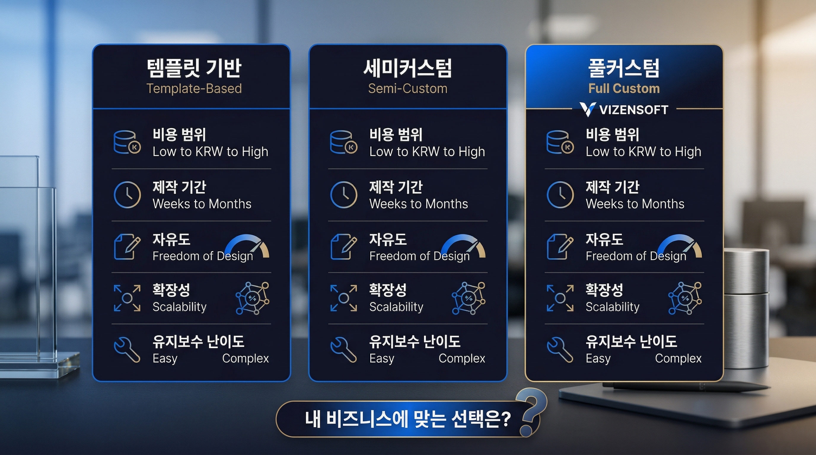 | 구분 | 템플릿/플랫폼 기반 | 세미커스텀 | 풀커스텀 개발 (비젠소프트) |