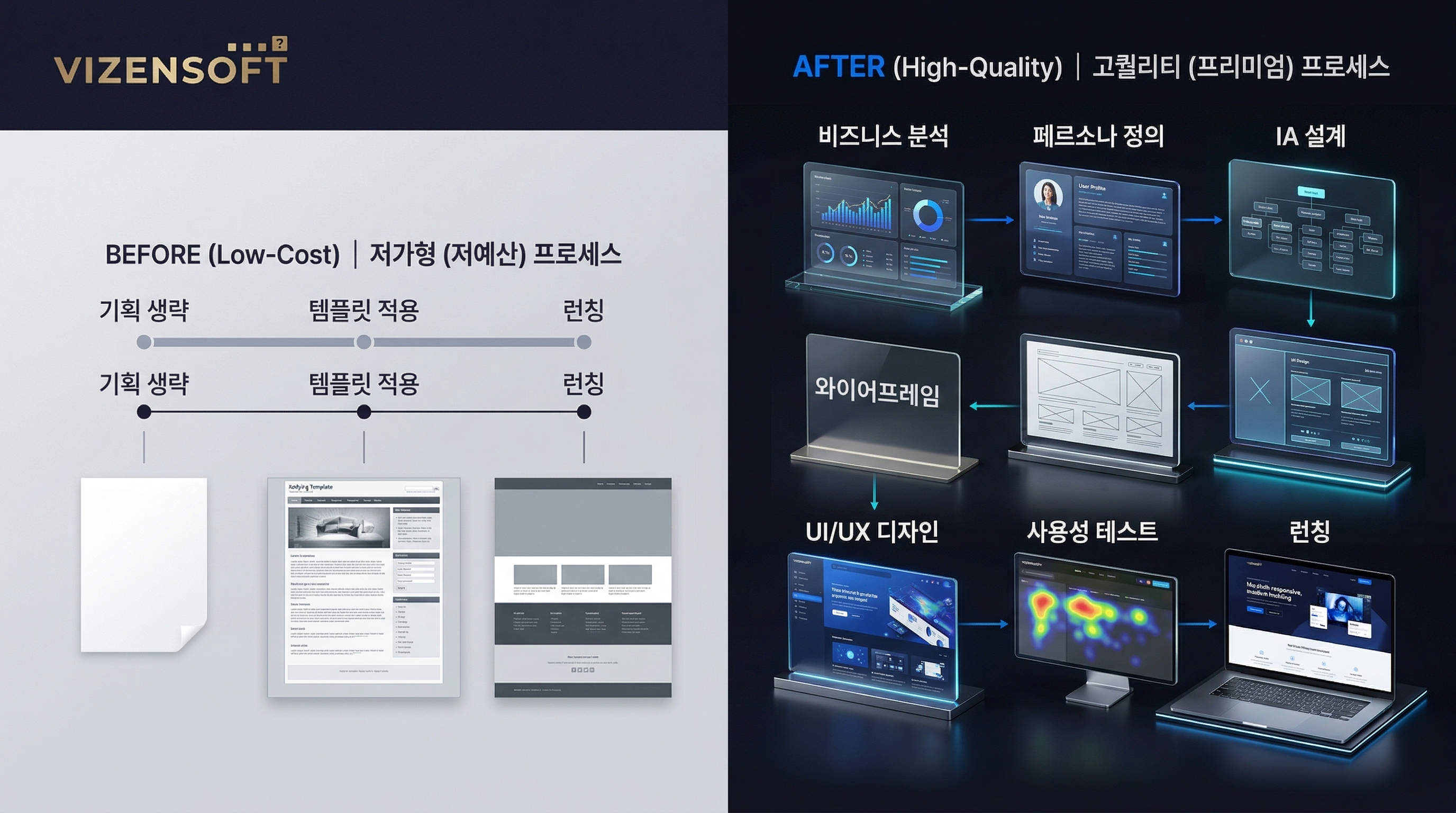 많은 업체들이 견적 단계에서 이 방식의 차이를 명확히 안내하지 않고 금액만 제시하기 때문에 혼란이 발생합니다. "500만 원짜리 홈페이지"와 "5,000만 원짜리 홈페이지"는 같은 홈페이지가 아닙니다. 자동차로 비유하면 경차와 대형 SUV 정도의 차이가 있습니다.