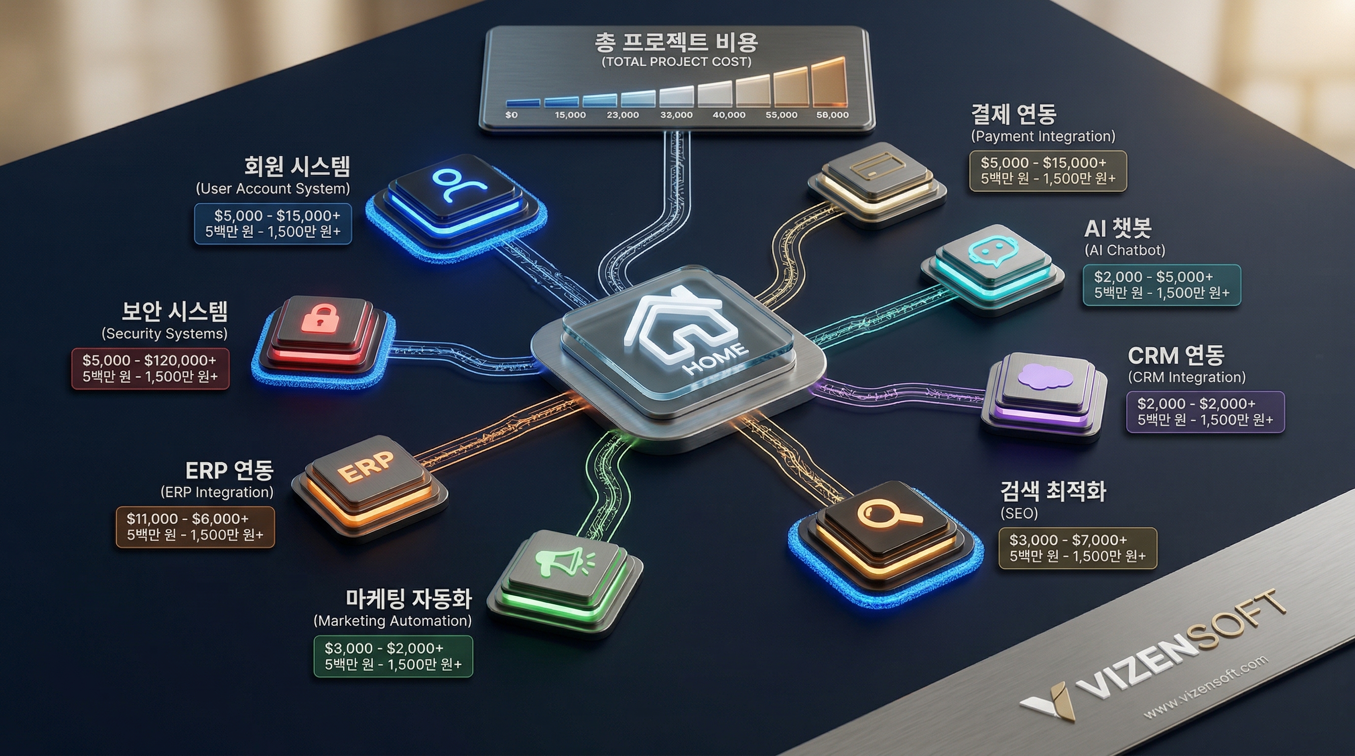 비젠소프트는 쇼핑몰 솔루션, AI 챗봇 솔루션, 웹로그/전환추적 시스템, SEO 관리 시스템, 마케팅 자동화 시스템 등을 자체 보유하고 있기 때문에, 홈페이지를 단순히 만드는 것을 넘어서 이 시스템들을 홈페이지에 통합 연동하는 것이 가능합니다. 예를 들어, 홈페이지 제작과 동시에 AI 챗봇을 연동해 24시간 고객 문의를 처리하거나, SEO 관리 시스템을 통해 검색 노출 성과를 지속적으로 개선하는 통합 솔루션을 제공합니다. 이런 부가 기능들의 개발 복잡도가 비용 차이를 만드는 핵심 이유 중 하나입니다.
