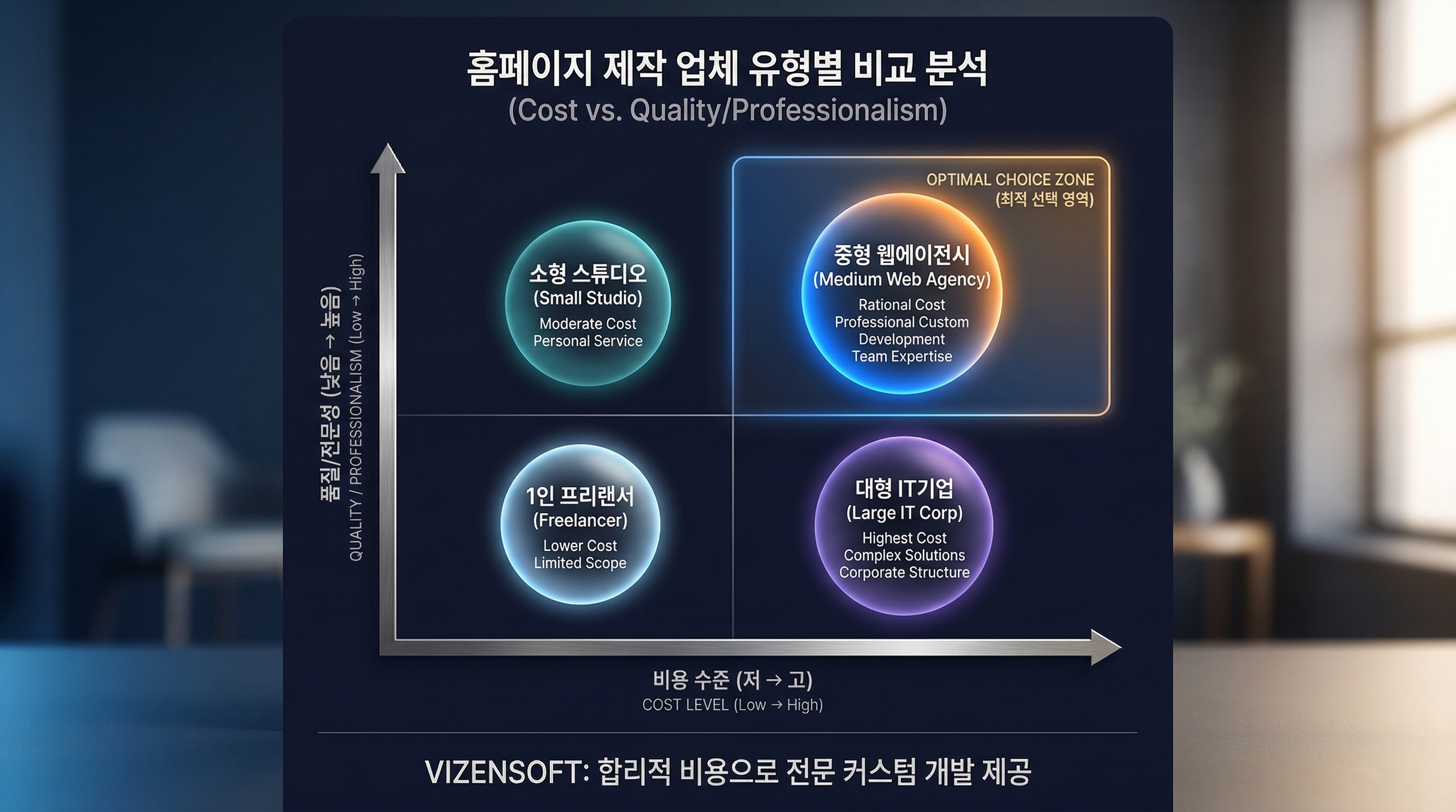 또한 홈페이지 제작 업체의 규모와 구조도 비용에 큰 영향을 미칩니다. 1인 프리랜서, 소규모 디자인 스튜디오, 중형 웹에이전시, 대형 IT 기업은 각각 인건비 구조, 작업 방식, 품질 관리 체계, 사후 지원 범위가 완전히 다릅니다. 비용 차이가 단순히 "마진의 차이"가 아니라 "결과물의 차이"라는 점을 먼저 명확히 인식해야 합니다.