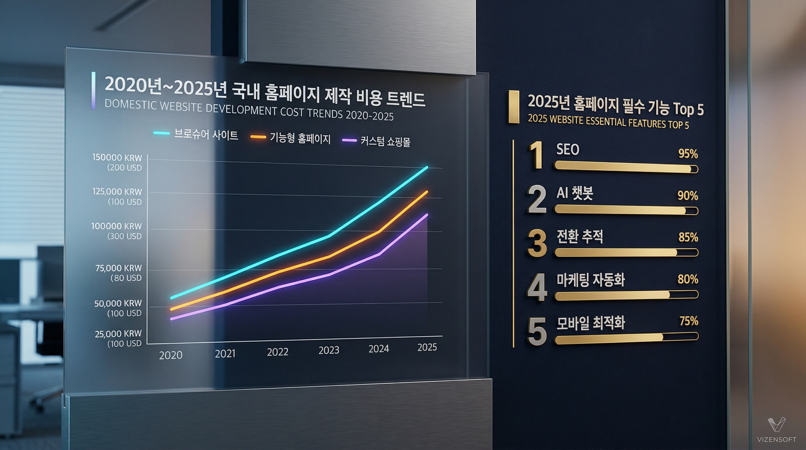 이제 시장에서는 단순히 "홈페이지 하나 만들어주세요"가 아니라, SEO 최적화 + 전환율 최적화 + 마케팅 자동화 + 데이터 분석 기능이 통합된 패키지형 홈페이지에 대한 니즈가 크게 늘고 있습니다. 이에 따라 웹에이전시 비용의 중간값도 꾸준히 상승하는 추세입니다. 단순 브로슈어 사이트 평균 비용은 2020년 180만 원 수준에서 2024년 270만 원 수준으로 올랐으며, 기능형 홈페이지는 같은 기간 평균 450만 원에서 680만 원으로 상승했습니다.