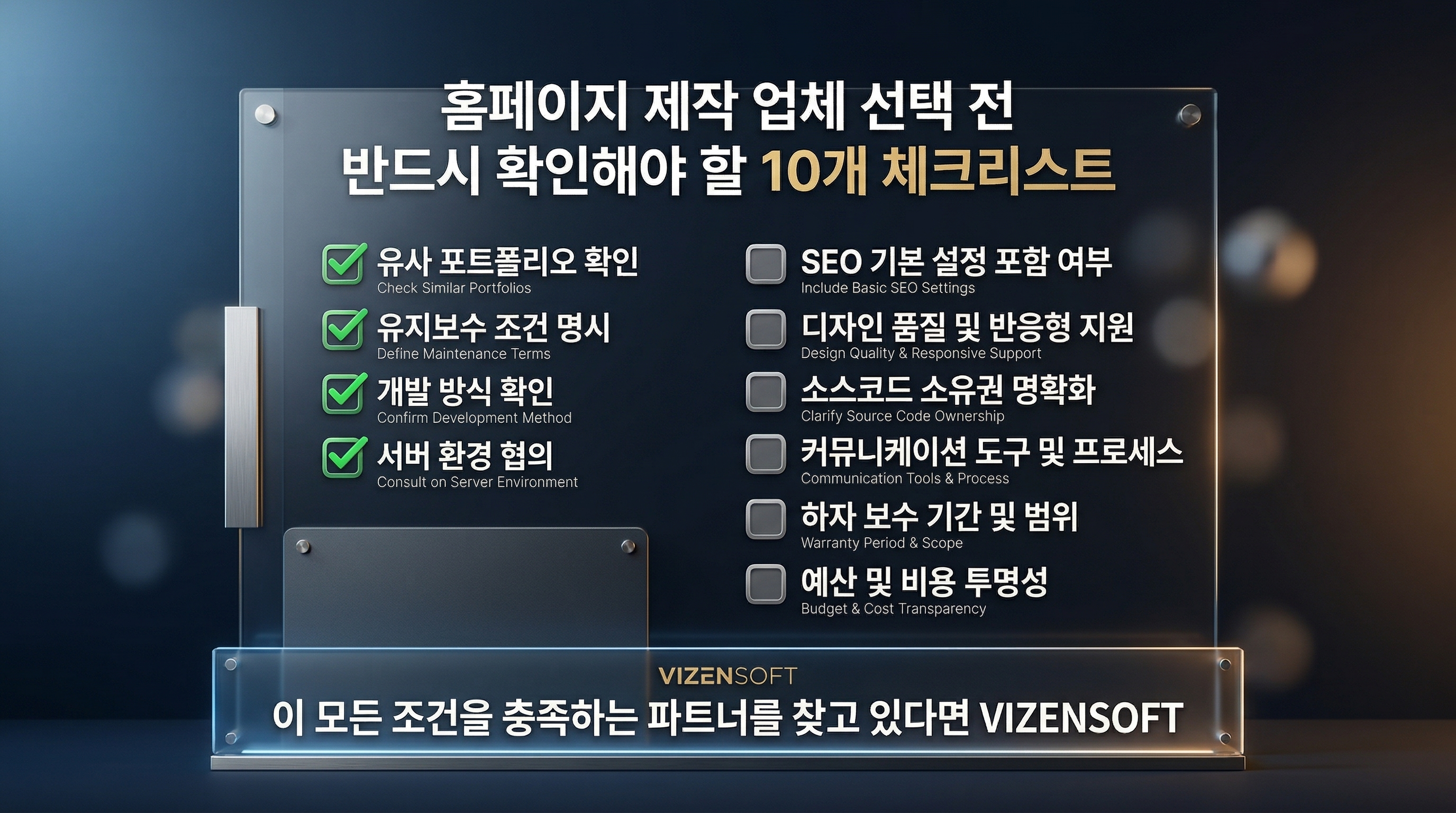 - ☑ 개발 방식 명확화: 템플릿 기반인지, 세미커스텀인지, 풀커스텀인지 반드시 확인 - ☑ 유사 포트폴리오 검토: 내 업종·규모와 비슷한 프로젝트 사례 3건 이상 확인 - ☑ 기획 단계 포함 여부: 와이어프레임, 정보구조 설계가 견적에 포함되어 있는지 확인 - ☑ 유지보수 조건 명시: 무상 유지보수 기간, 이후 유지보수 단가 계약 조건 사전 확인 - ☑ 서버/도메인 환경: 서버 사양, 공유호스팅/전용서버 여부, 비용 포함 여부 확인 - ☑ SEO 기본 설정 포함 여부: 메타 태그, OG 태그, 사이트맵, robots.txt 설정 포함 확인 - ☑ 소스코드 소유권: 완성된 소스코드의 소유권이 고객사에게 귀속되는지 계약서 확인 - ☑ 반응형 웹 보장: 데스크탑, 태블릿, 모바일 3가지 환경 테스트 결과 요청 - ☑ 계약서 상세도: 범위, 일정, 수정 횟수, 추가 비용 발생 조건이 명확히 기재되었는지 확인 - ☑ 업체 안정성: 사업자 등록, 법인 여부, 운영 연수, 직원 수 확인