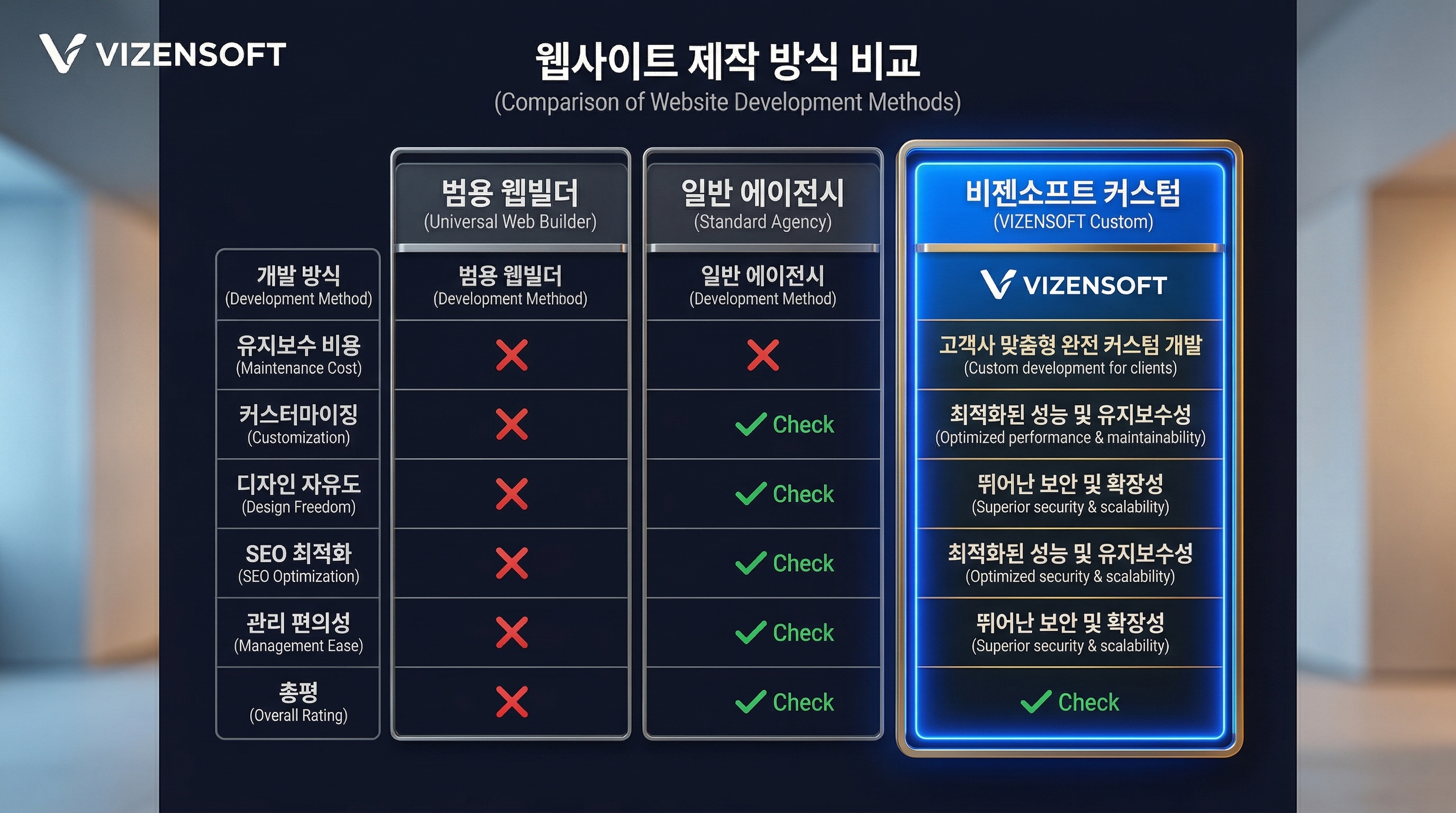 | 구분 | 범용 웹빌더 (Wix, Cafe24 등) | 일반 웹 에이전시 | 비젠소프트 커스텀 개발 |