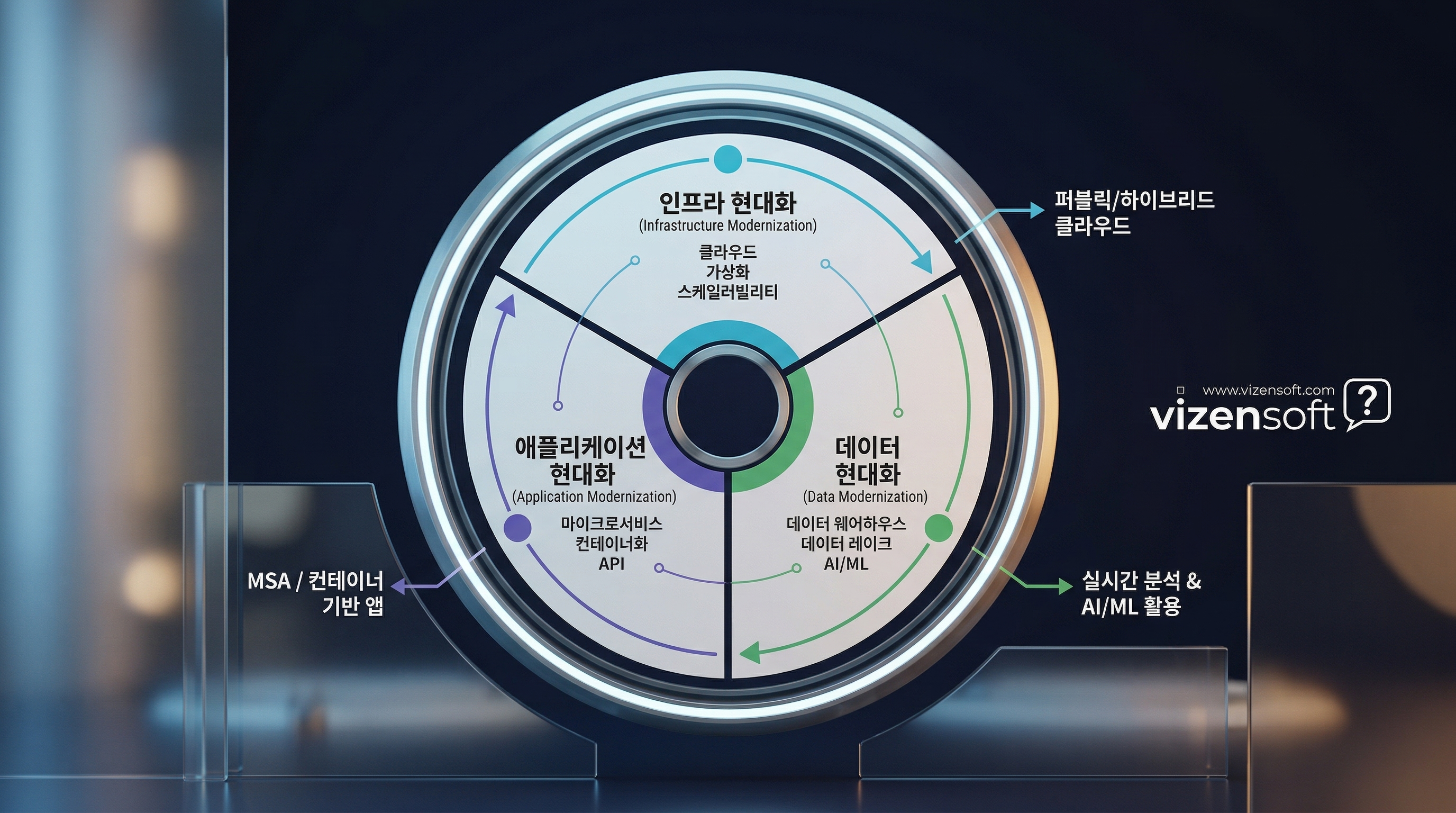 IT 현대화의 범위는 크게 세 가지로 구분할 수 있습니다. ① 인프라 현대화 (온프레미스 서버 → 클라우드 마이그레이션), ② 애플리케이션 현대화 (레거시 앱 리아키텍처링 또는 재개발), ③ 데이터 현대화 (사일로화된 데이터를 통합·분석 가능한 구조로 재편). 이 세 영역이 유기적으로 연결될 때 비로소 진정한 레거시 현대화가 완성됩니다.