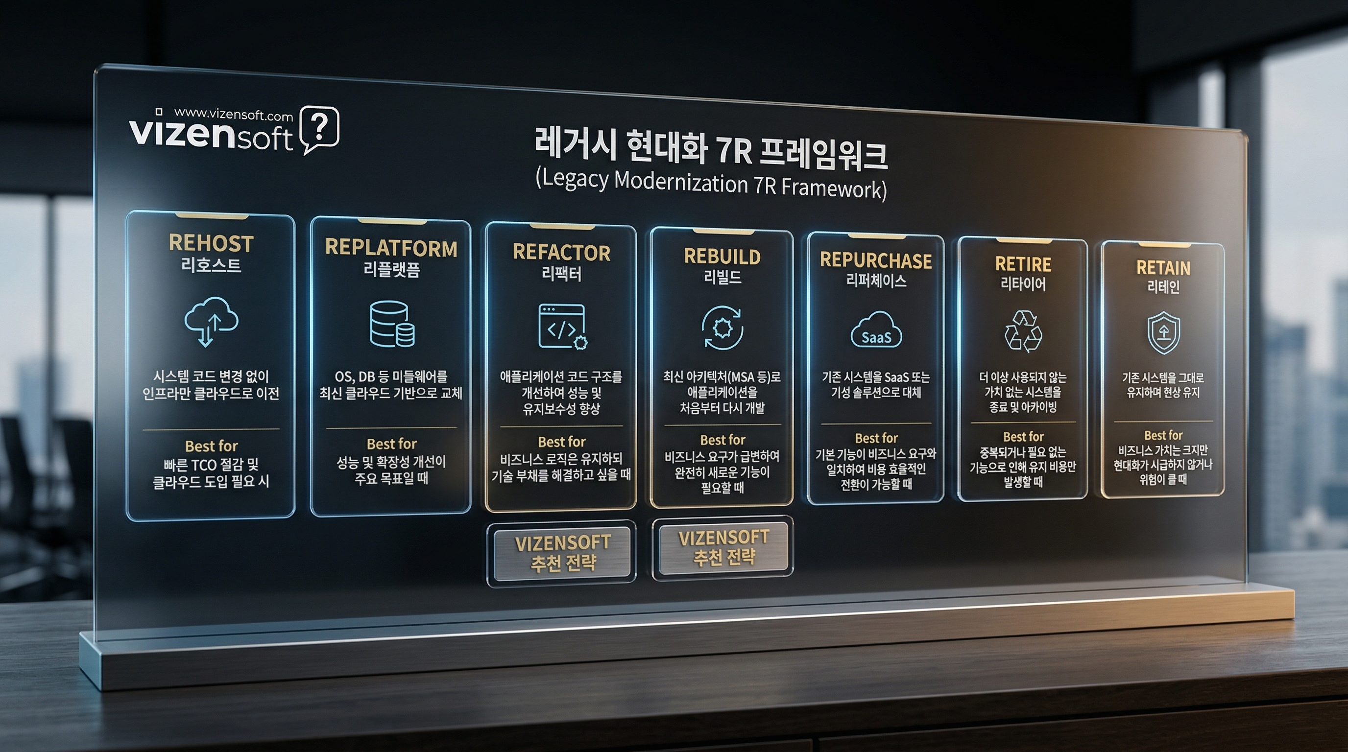 레거시 현대화를 시작할 때 가장 먼저 해야 할 일은 어떤 방식으로 현대화할 것인지 전략을 명확히 결정하는 것입니다. 글로벌 IT 컨설팅 업계에서 표준처럼 활용되는 '7R 프레임워크'는 레거시 현대화 전략을 7가지 옵션으로 분류합니다.