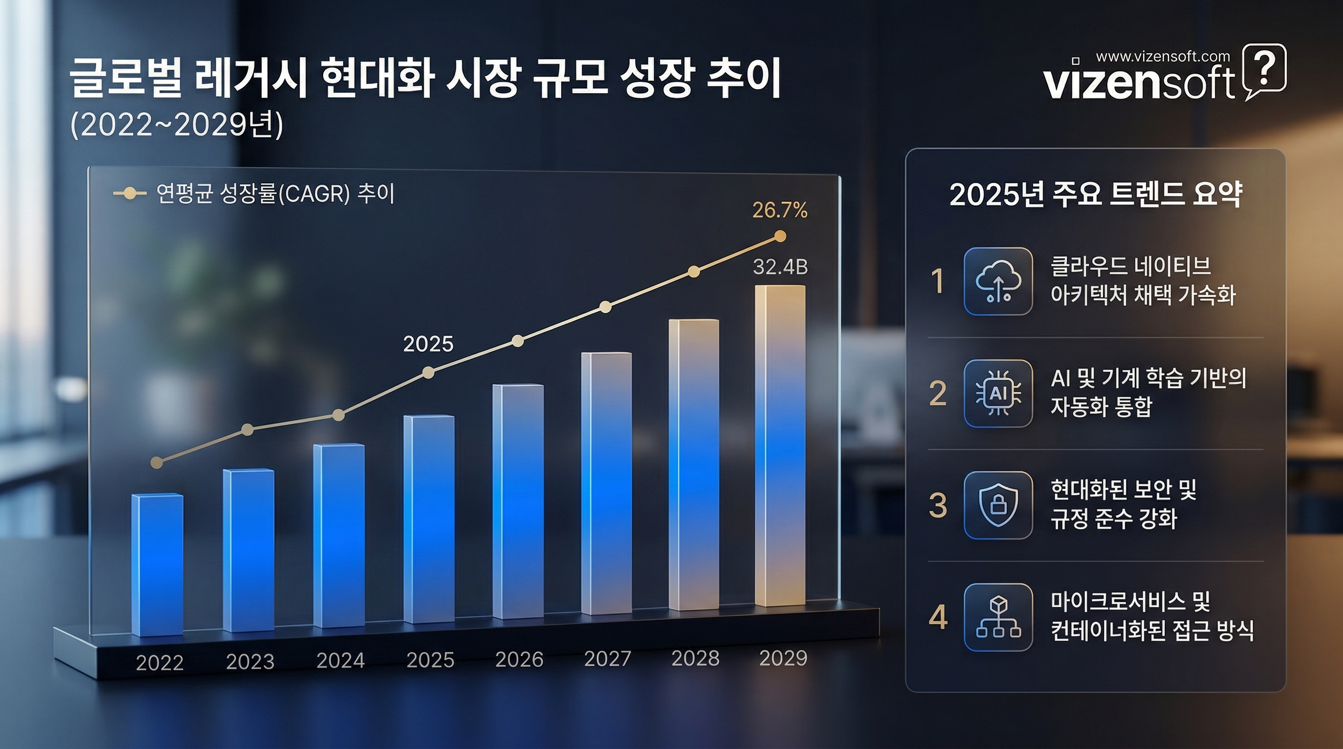 레거시 현대화 시장은 빠르게 성장하고 있습니다. 글로벌 레거시 현대화 시장 규모는 2024년 약 162억 달러에서 2029년까지 연평균 15.5% 성장하여 약 333억 달러에 달할 것으로 전망됩니다 (MarketsandMarkets, 2024). 국내 시장도 디지털 전환(DX) 정책과 기업들의 경쟁력 강화 필요성으로 인해 급속히 확대되고 있습니다.