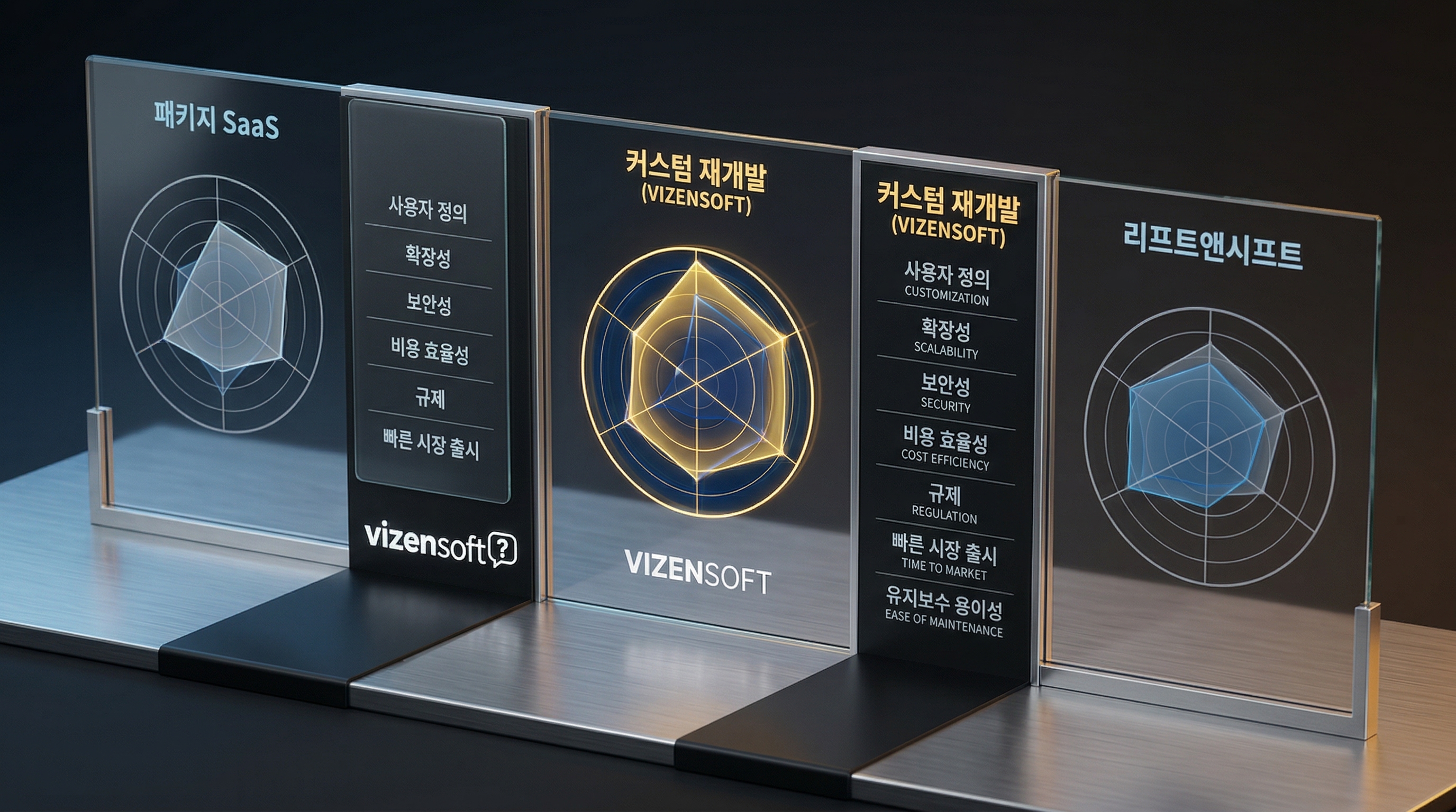 | 구분 | 패키지 SaaS 도입 | 커스텀 재개발 (비젠소프트) | 클라우드 리프트앤시프트 |
