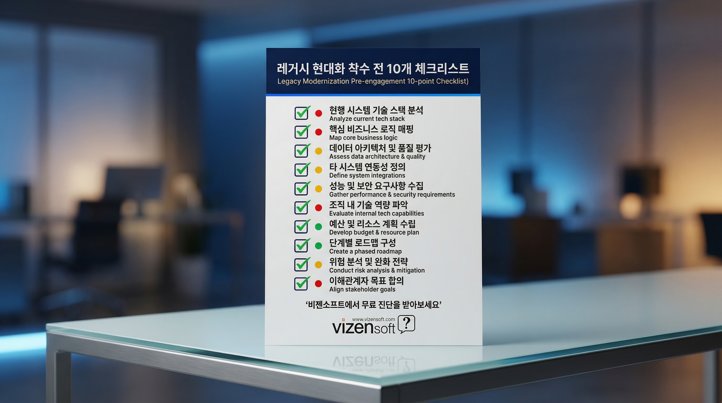 본격적으로 레거시 현대화를 시작하기 전에 아래 체크리스트를 반드시 점검하세요. 이 항목들을 미리 준비한 기업과 그렇지 않은 기업의 프로젝트 성공률은 2~3배 차이가 납니다.