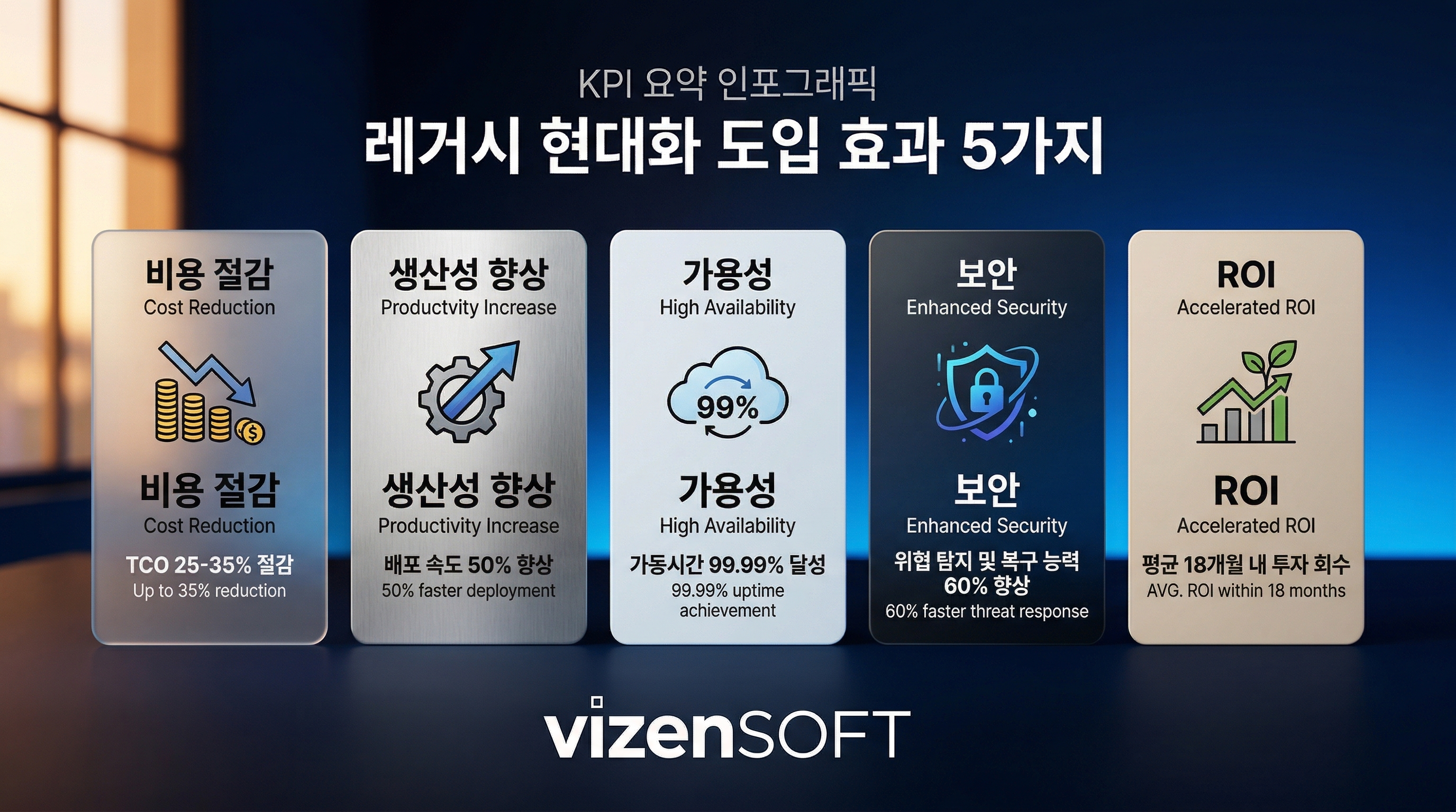 🔵 비용 효율화: IT 유지보수 비용 평균 25~45% 절감 (Forrester Research, 2024). 레거시 시스템의 높은 운영 비용이 절감되면서 혁신 투자 여력이 확보됩니다.
