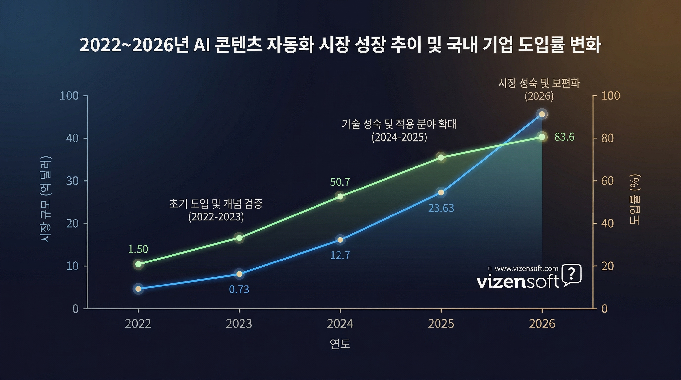 국내 디지털 마케팅 시장에서 AI 콘텐츠 자동화 도입률은 2024년 기준 23%에서 2025년 말 47%까지 확대될 것으로 한국인터넷진흥원(KISA)은 전망합니다. 이미 도입한 기업의 78%가 "콘텐츠 생산 비용 절감"과 "검색 유입 트래픽 증가"를 가장 큰 도입 효과로 꼽고 있습니다.