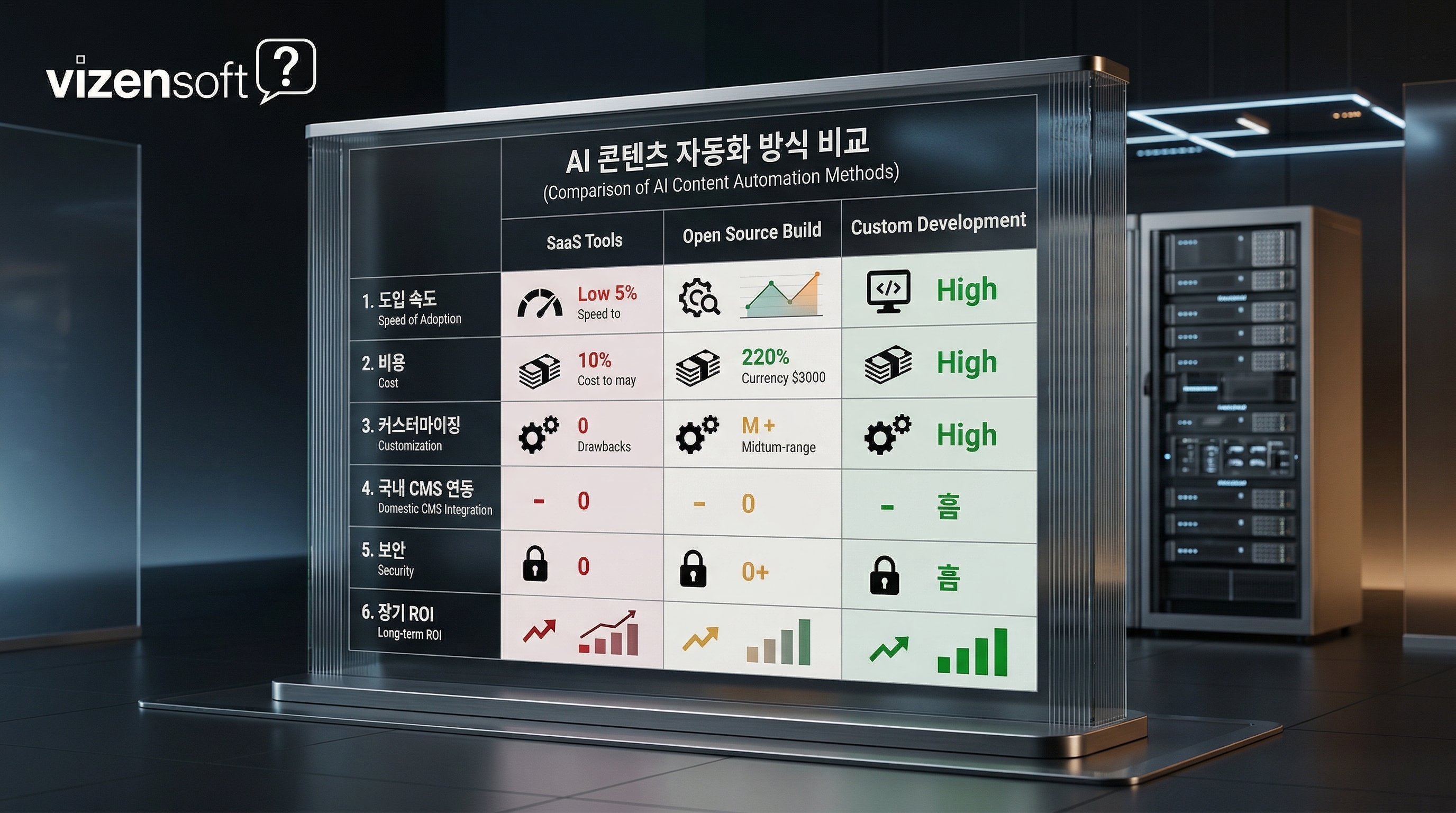 AI 콘텐츠 자동화를 도입하려는 기업이 직면하는 첫 번째 고민은 "어떤 방식으로 구현할 것인가"입니다. 크게 세 가지 접근법이 있습니다: ①SaaS 도구 사용, ②오픈소스 기반 자체 구축, ③커스텀 개발. 각각의 장단점을 냉정하게 분석해 보겠습니다.