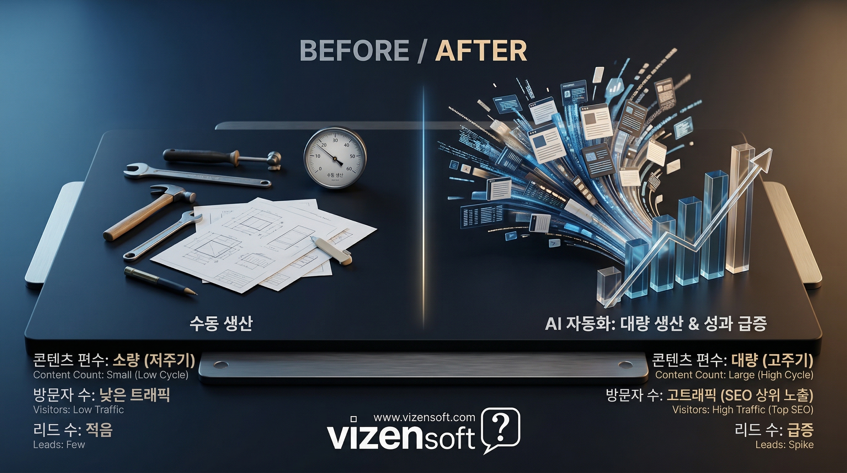 핵심은 "무조건 자동화"가 아니라 "올바른 자동화"입니다. AI가 반복적이고 시간 소모적인 콘텐츠 생산 작업을 담당하는 동안, 여러분의 팀은 더 창의적이고 전략적인 업무에 집중할 수 있습니다. 그리고 그 결과로 콘텐츠 마케팅의 양과 질이 동시에 높아지고, 검색 유입과 리드 창출이 기하급수적으로 성장하는 선순환이 만들어집니다.