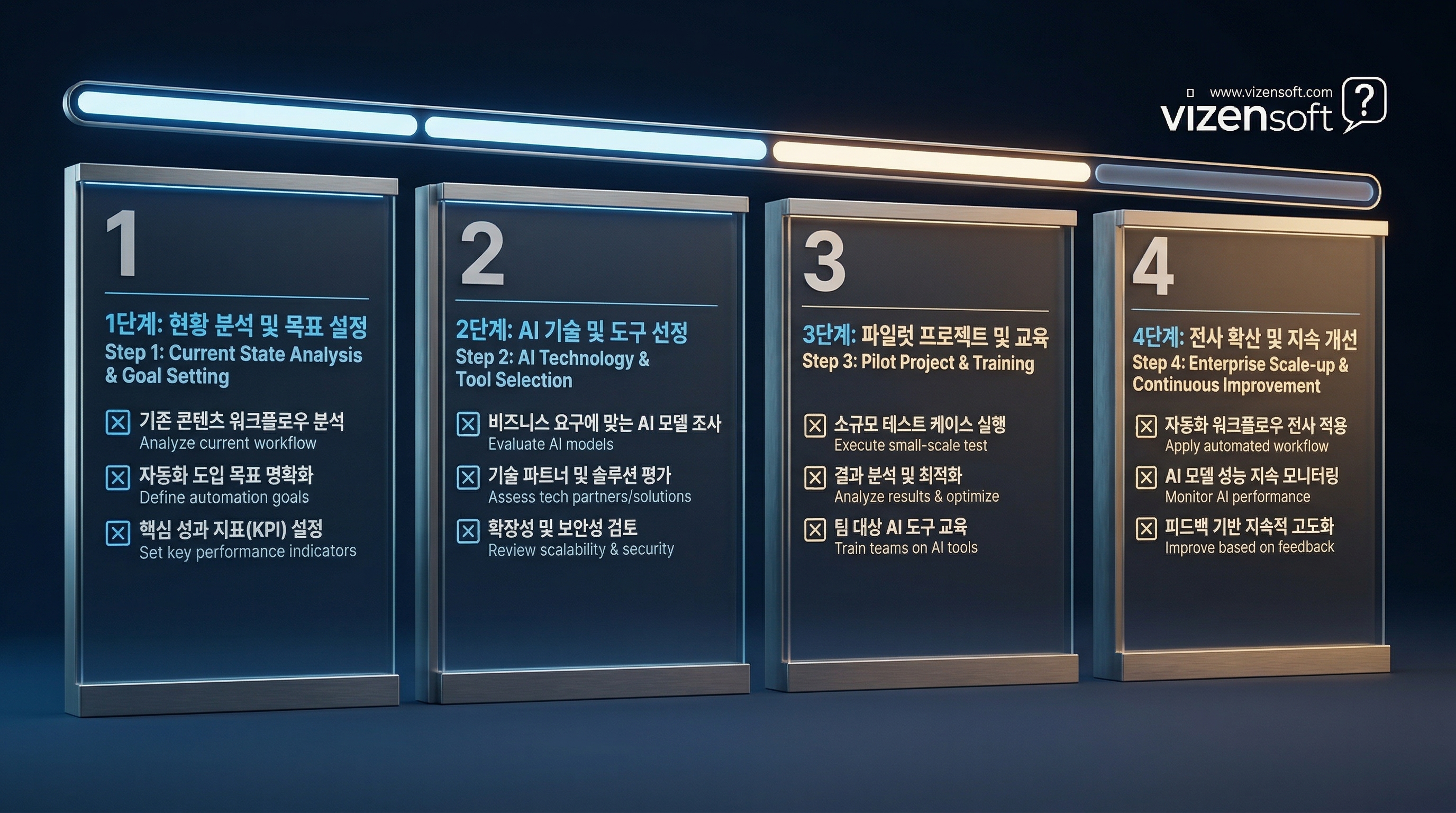 AI 콘텐츠 자동화를 성공적으로 도입하기 위한 단계별 준비 가이드입니다. 이 체크리스트를 하나씩 확인하면서 자사의 준비 상태를 점검해 보세요. 🔍