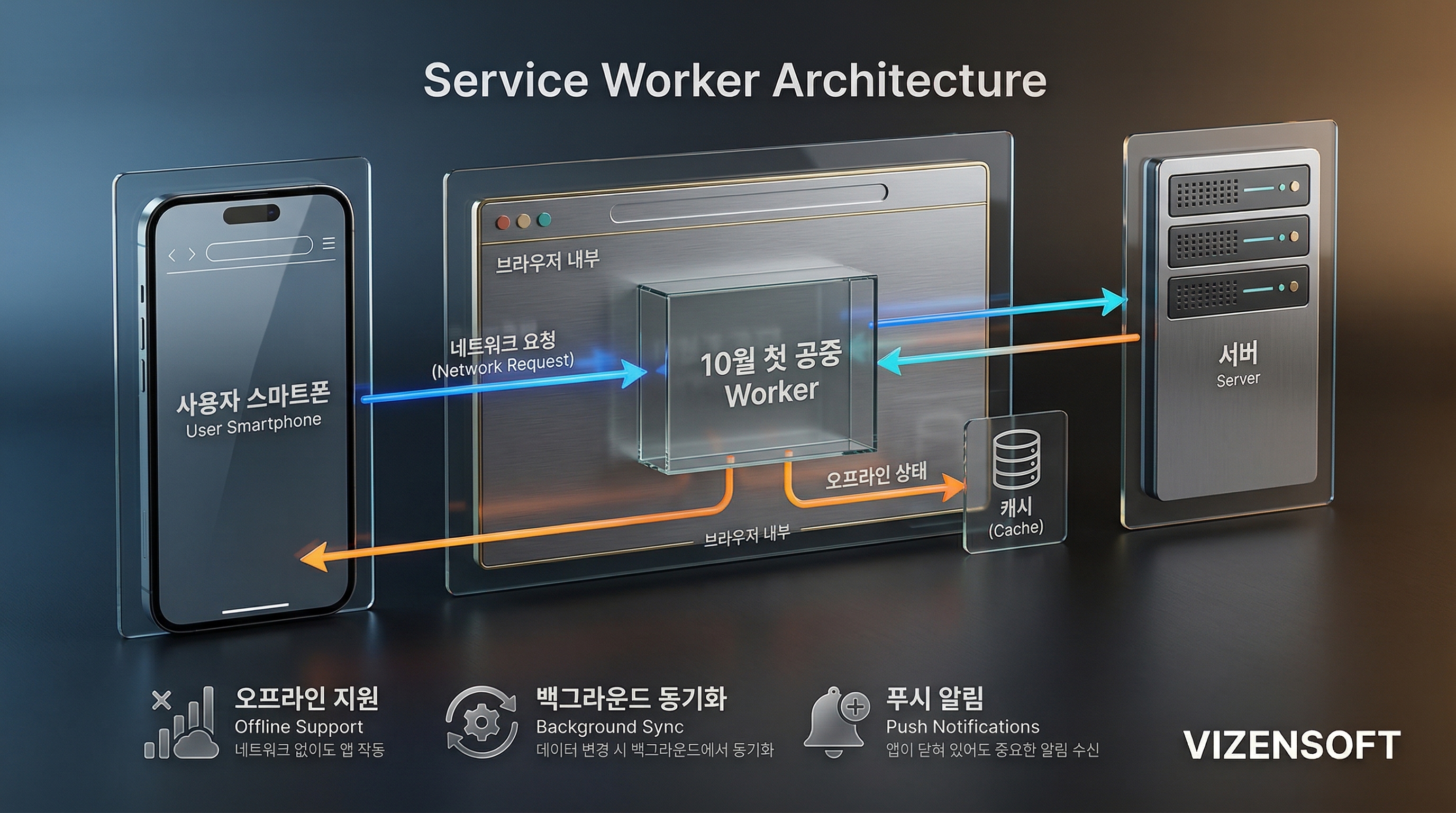 PWA를 일반 웹과 구분하는 가장 핵심적인 기술이 바로 서비스 워커(Service Worker) 입니다. 서비스 워커는 브라우저 뒤에서 백그라운드로 실행되는 JavaScript 파일로, 웹페이지와 독립적으로 동작하며 네트워크 요청을 중간에서 가로채 캐시(저장된 데이터)를 활용할 수 있게 해줍니다. 쉽게 말하면 앱과 서버 사이에서 일종의 프록시 역할을 하는 스마트한 중간 관리자라고 이해하면 됩니다.