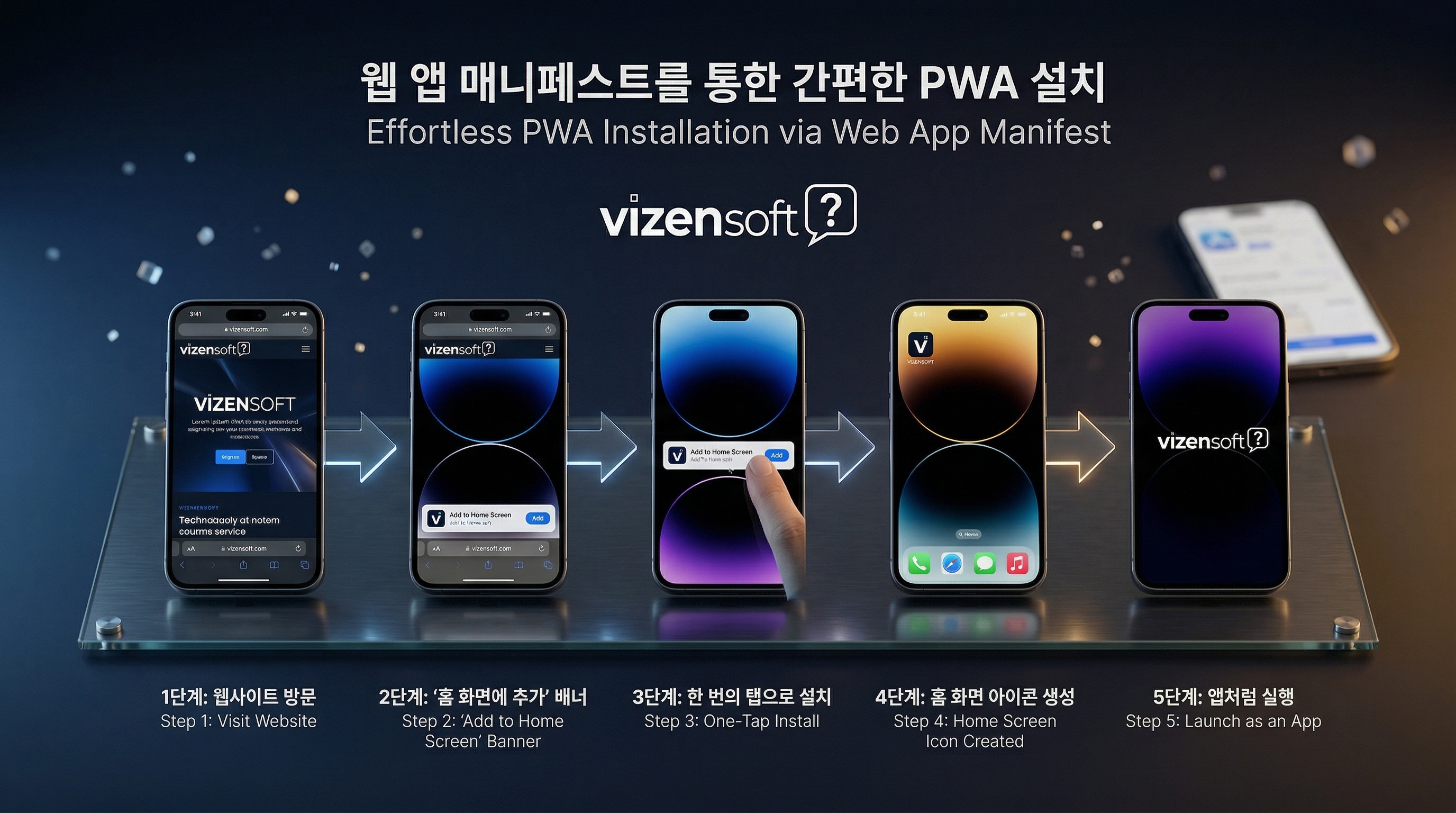 웹 앱 매니페스트(Web App Manifest) 는 PWA가 "앱처럼 보이게" 만드는 핵심 파일입니다. 이것은 단순한 JSON 형식의 텍스트 파일인데, 앱 이름, 아이콘, 시작 URL, 화면 방향, 배경색, 테마 색상 등 앱의 외관과 동작 방식을 정의합니다. 브라우저는 이 매니페스트 파일을 읽어 사용자에게 "홈 화면에 추가" 배너를 자동으로 표시하고, 사용자가 동의하면 앱스토어 없이 홈 화면에 앱이 설치됩니다.