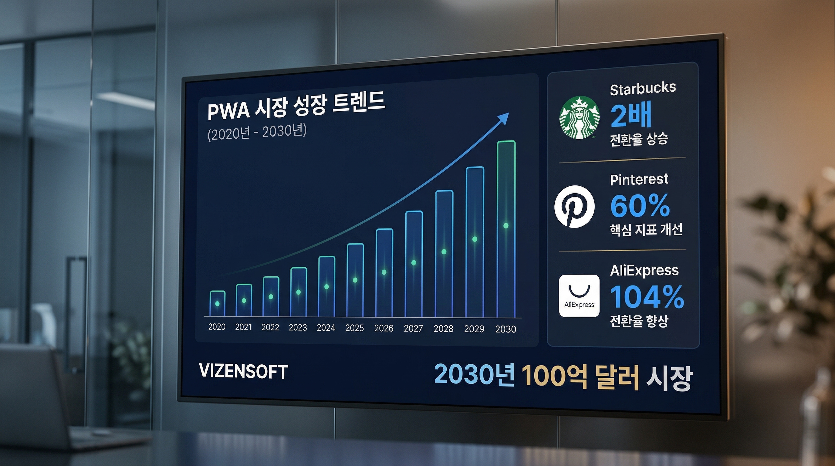 글로벌 PWA 시장은 폭발적으로 성장하고 있습니다. 리서치 기관 Allied Market Research에 따르면, 전 세계 PWA 시장 규모는 2023년 약 14억 달러에서 2030년에는 100억 달러 이상으로 성장할 것으로 전망되며, 연평균 성장률(CAGR)은 31.9%에 달합니다. 이는 클라우드, AI와 함께 가장 빠르게 성장하는 소프트웨어 분야 중 하나입니다.