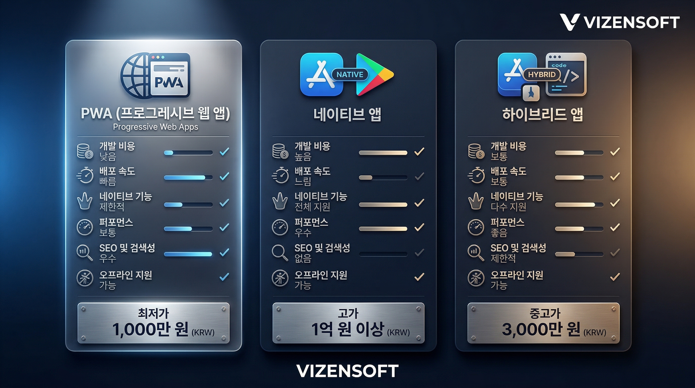 PWA가 좋다는 건 알겠는데, "그럼 네이티브 앱은 필요 없는 건가요?" 라는 질문을 많이 받습니다. 솔직하게 말씀드리면, 프로젝트 성격과 예산에 따라 최적의 선택이 달라집니다. 아래 비교표를 통해 세 가지 방식의 특성을 한눈에 확인해보세요.