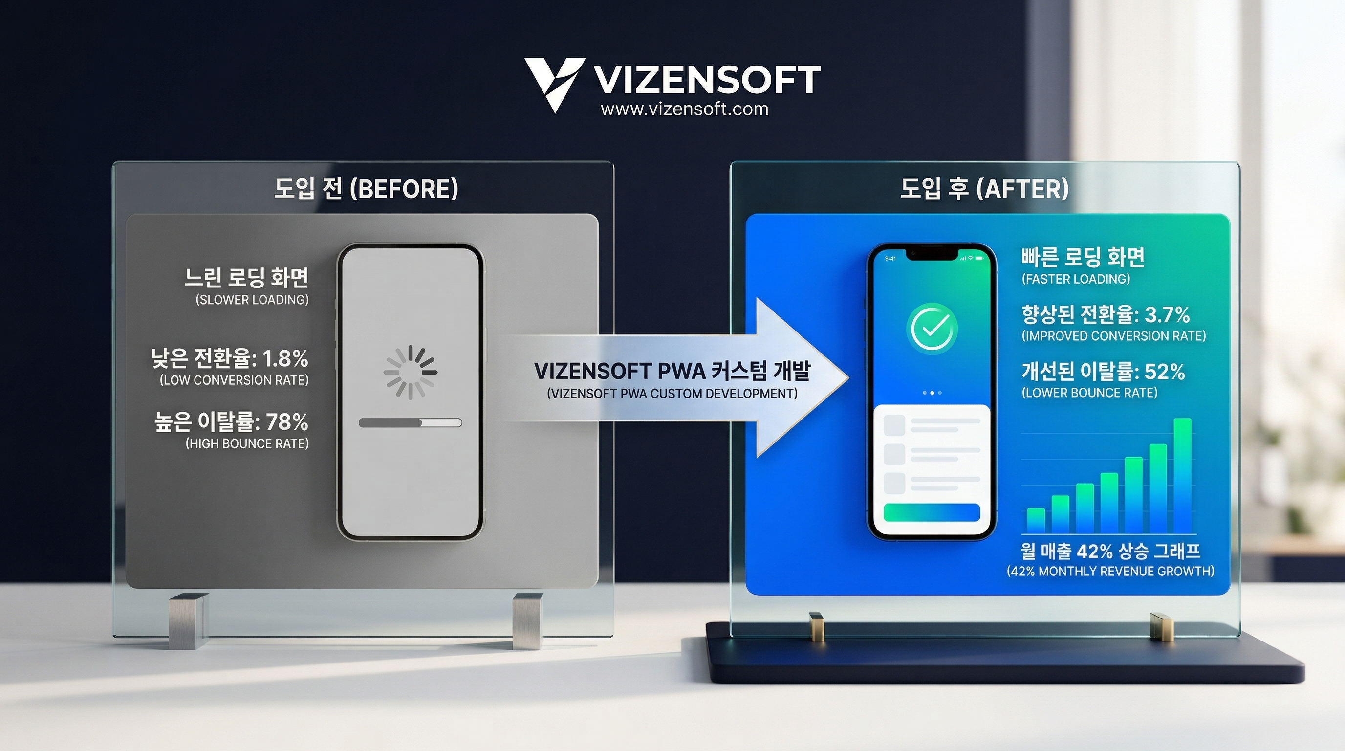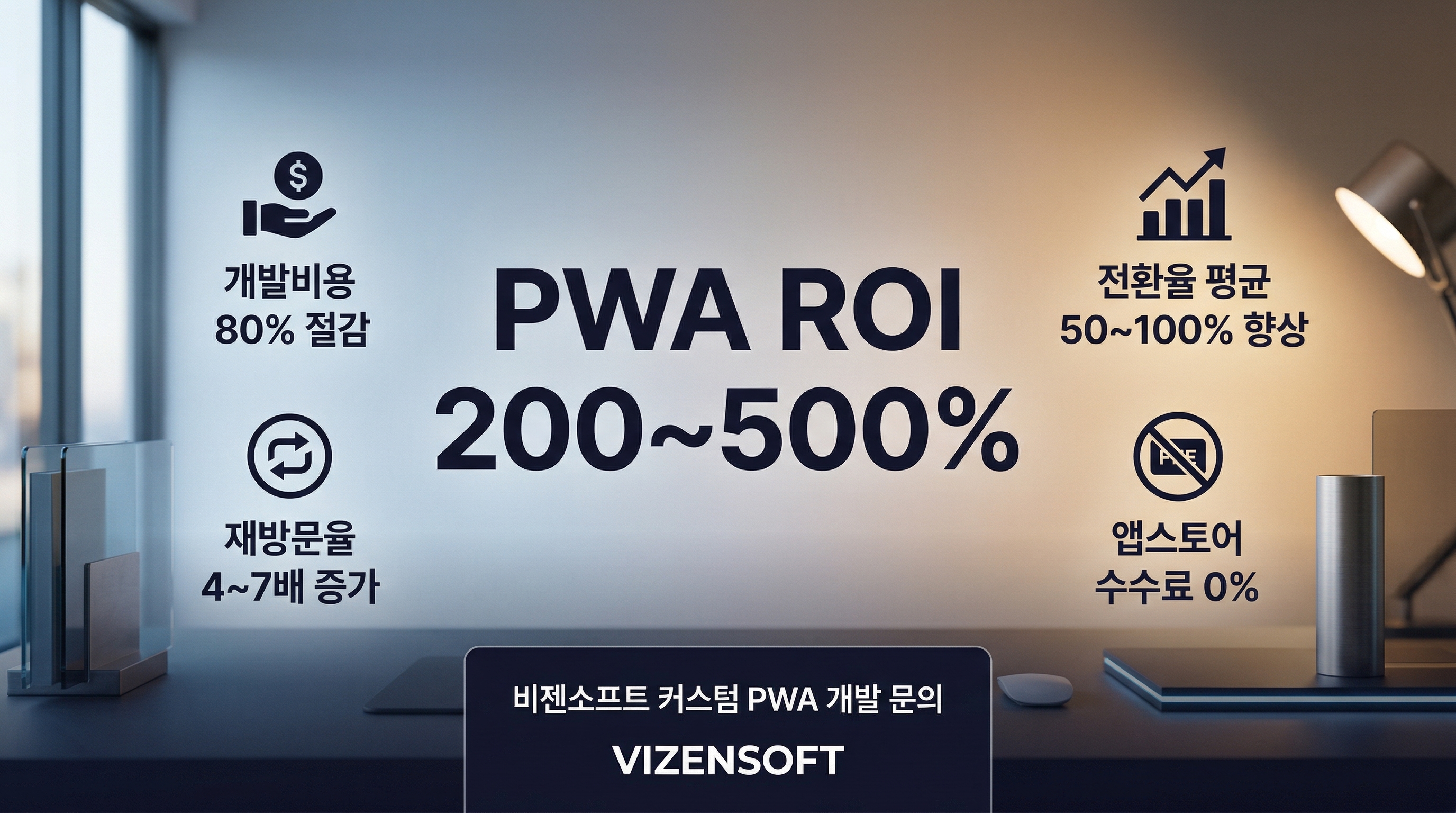 매출 측면에서는 전환율 향상이 핵심입니다. 로딩 속도가 1초 빨라질 때마다 전환율은 평균 7% 향상된다는 구글의 연구 데이터가 있습니다. PWA로 로딩 속도를 3초 단축하면 이론상 전환율이 21% 이상 개선됩니다. 월 매출 1억 원 쇼핑몰이라면 월 2,100만 원, 연 2억 5,000만 원 이상의 추가 매출 효과가 기대됩니다. 푸시 알림 기반 재방문율 향상, SEO를 통한 신규 유입 증가까지 더하면 ROI 200~500% 를 달성한 사례도 드물지 않습니다. 비젠소프트의 마케팅 자동화 시스템과 PWA를 결합하면 푸시 알림 발송부터 전환 추적, 재마케팅까지 자동화된 성장 엔진을 구축할 수 있습니다.