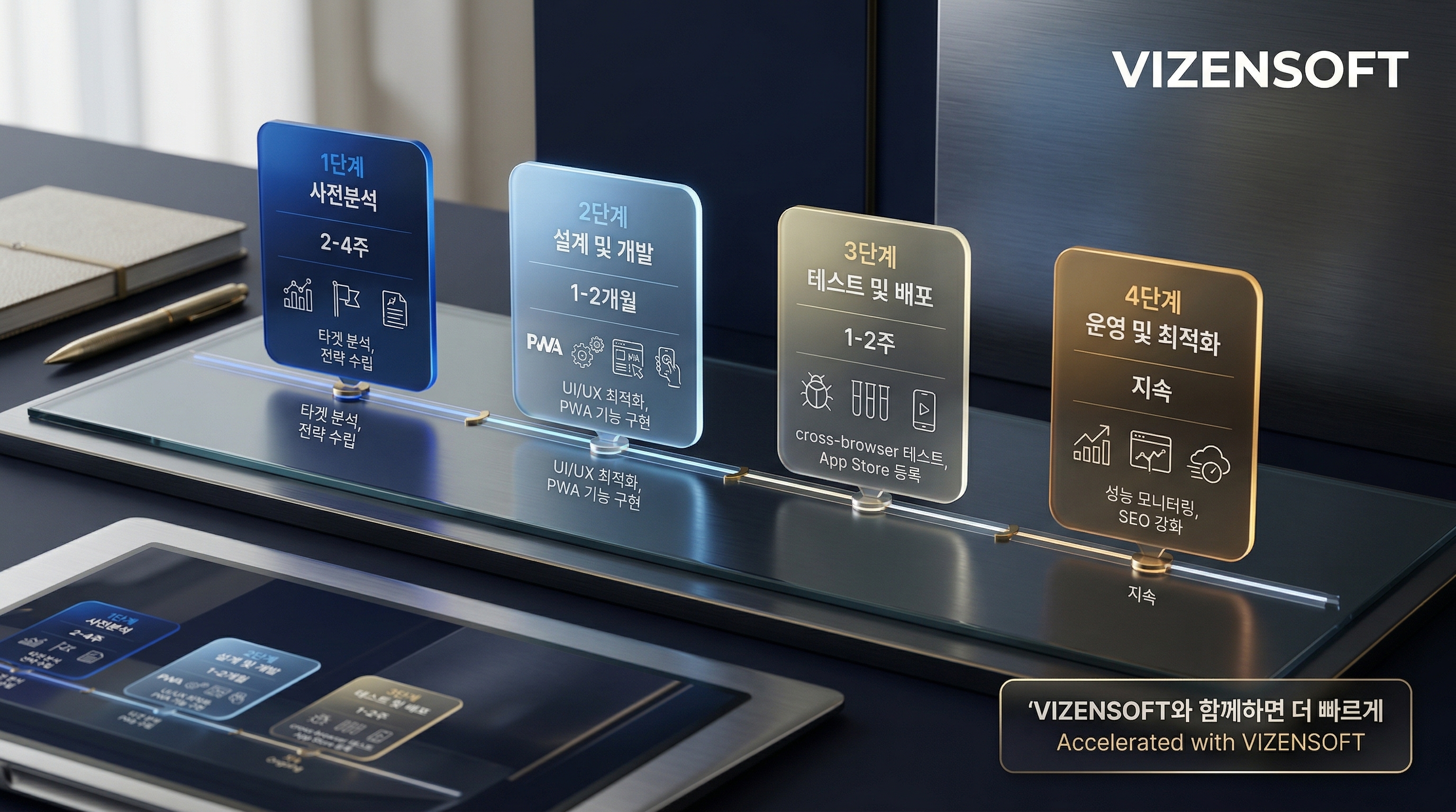 기존 웹사이트의 기술 스택(어떤 언어·프레임워크로 만들어졌는지)에 따라 다릅니다. React, Vue.js 같은 현대적 프레임워크로 개발된 사이트라면 2~4주 내에 PWA 핵심 기능(서비스 워커, 매니페스트, 오프라인 지원)을 추가할 수 있습니다. 레거시 코드베이스라면 부분 리빌드가 필요해 2~4개월이 소요될 수 있습니다. 정확한 기간과 비용은 아래 서명 블록을 통해 문의해 주시면 무료로 검토해 드립니다.