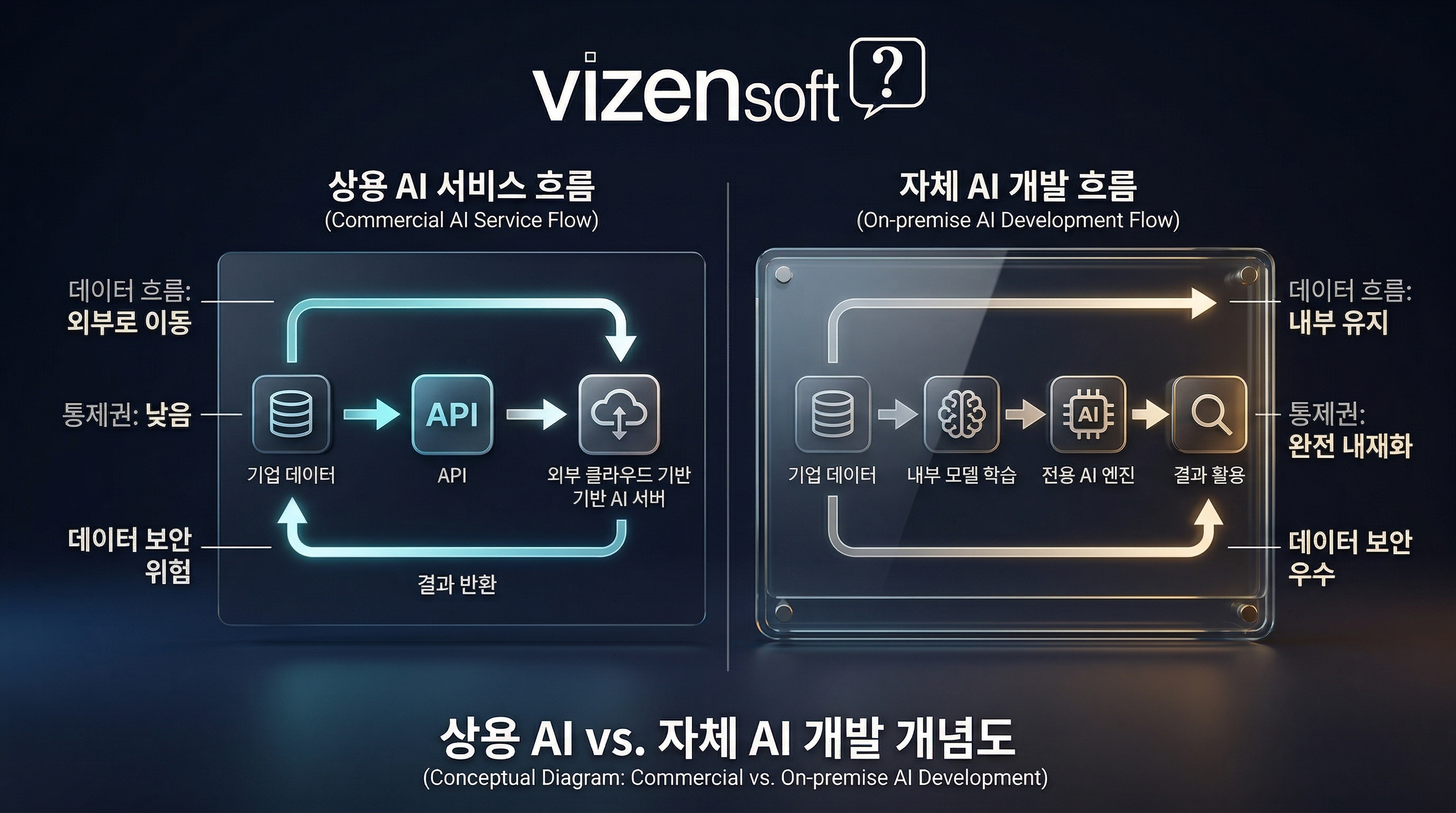왜 이 선택이 중요할까요? AI는 단순한 툴이 아니라 기업의 핵심 경쟁력과 직결됩니다. 상용 AI를 선택하면 빠르게 도입할 수 있지만 데이터가 외부 서버로 전송되고, 경쟁사도 동일한 AI를 쓸 수 있다는 한계가 있습니다. 반면 자체 개발은 시간과 비용이 들지만 완전한 데이터 통제권과 고유한 경쟁 우위를 갖게 됩니다. 어느 쪽이 정답인지는, 기업의 현재 상황을 냉정하게 분석한 후에야 알 수 있습니다.