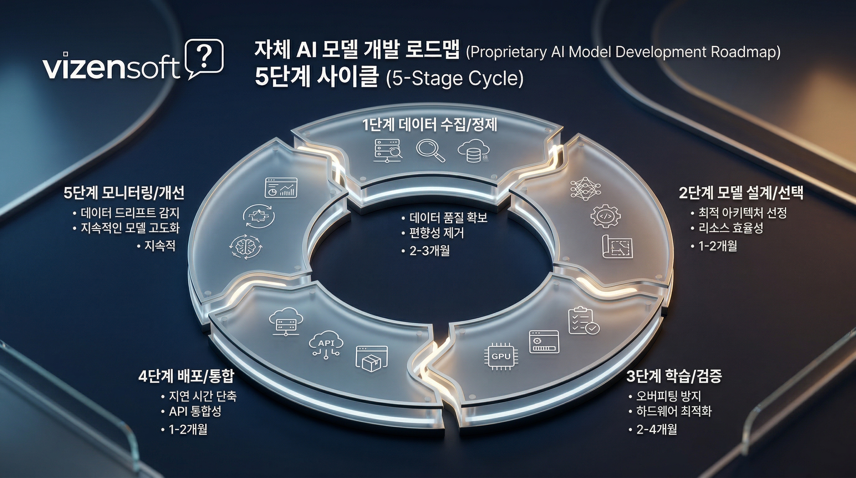 가능합니다. 단, 처음부터 대규모 자체 개발에 도전하는 것은 현실적이지 않습니다. 오픈소스 소형 언어 모델(Llama, Mistral 등)을 자사 데이터로 파인튜닝하거나, 전문 개발사와 협력하여 특정 기능에 집중한 AI 모듈을 개발하는 방식이 중소기업에 현실적입니다. 비젠소프트처럼 커스텀 개발에 특화된 전문사와 협업하면 초기 투자 부담을 크게 줄일 수 있습니다.
