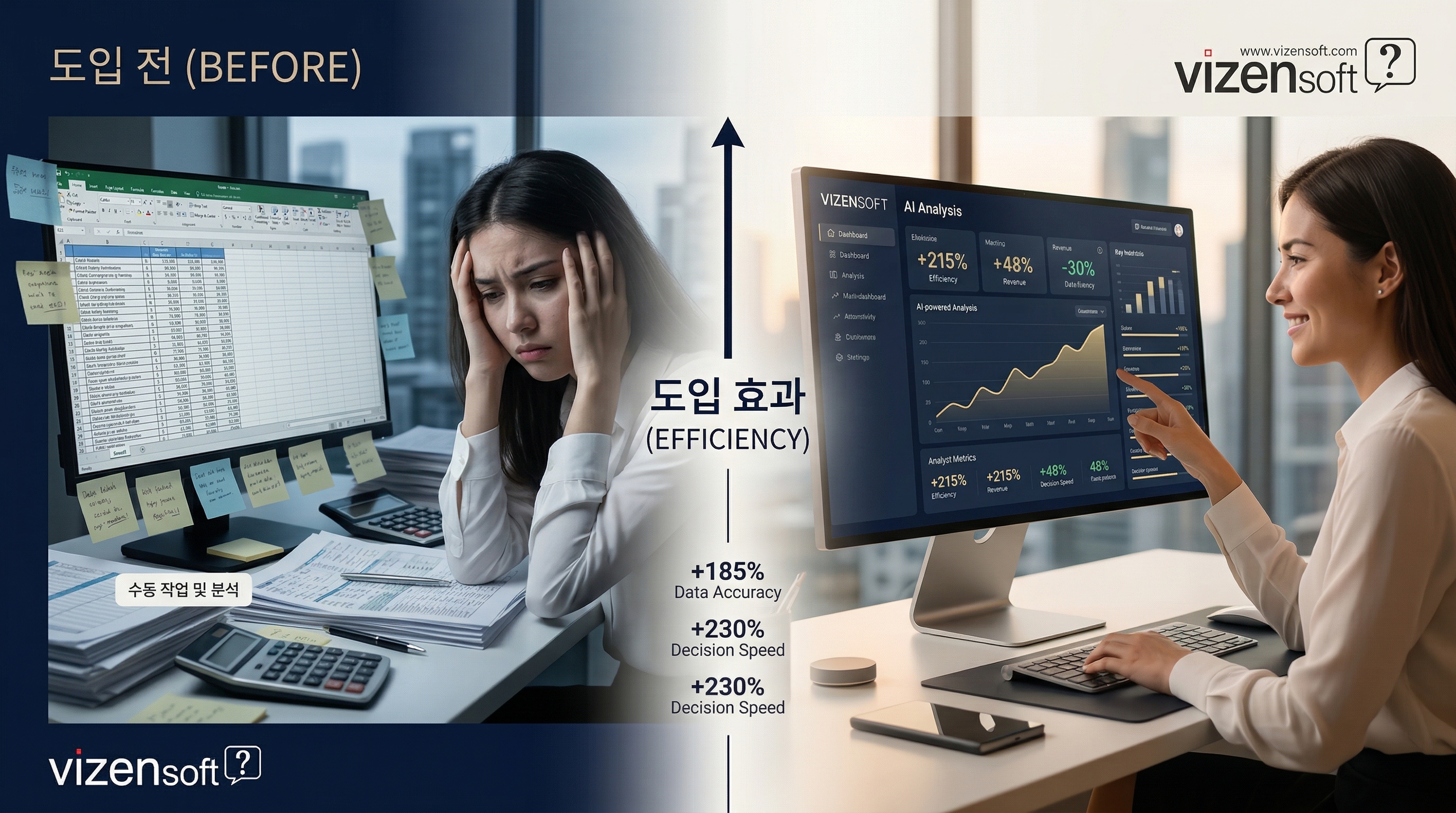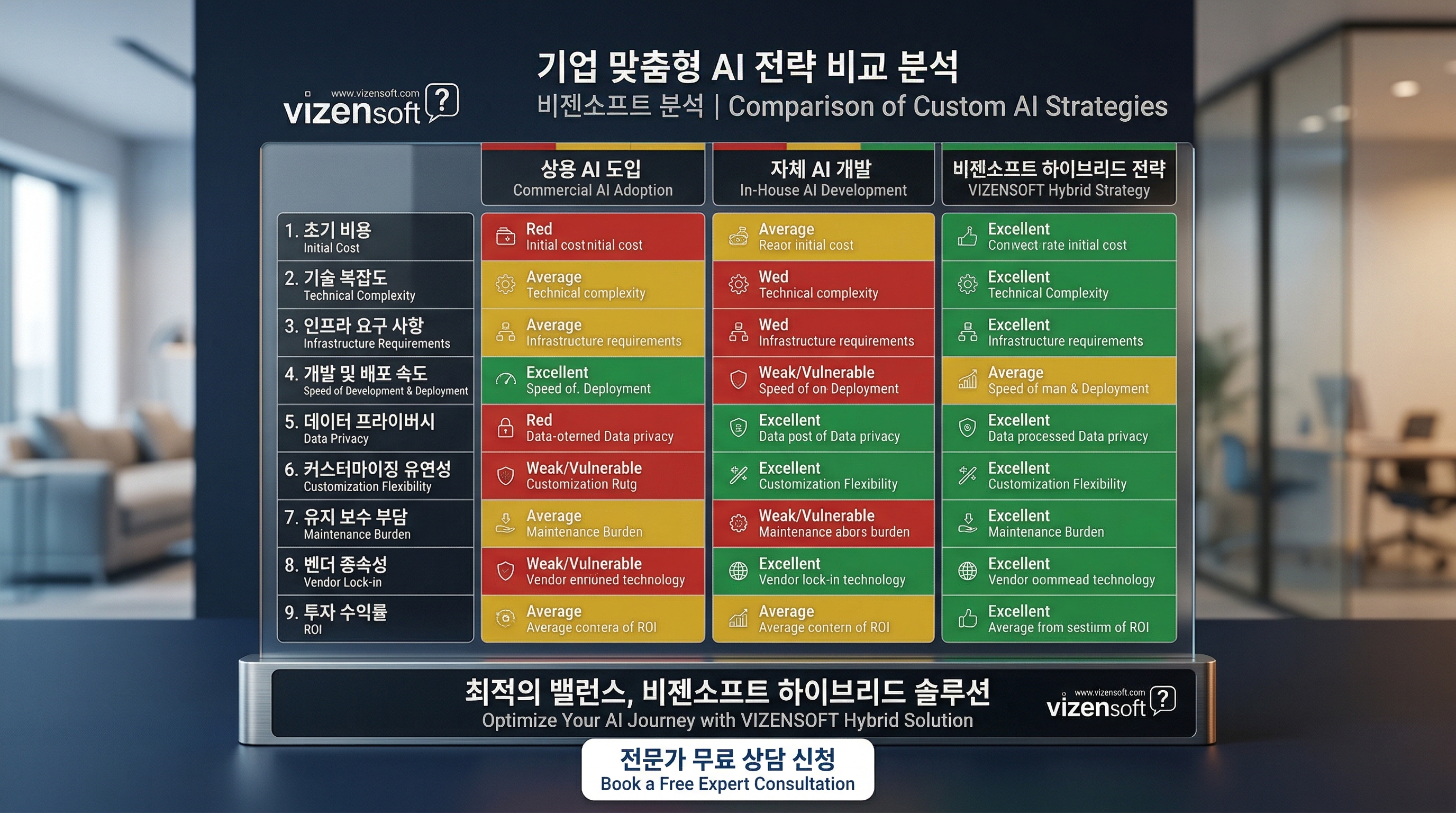 이 표를 바탕으로 자사의 위치를 파악했다면, 다음 단계는 구체적인 실행 계획 수립입니다. 여기서 전문 파트너의 역할이 중요해집니다. 비젠소프트는 AI 전략 컨설팅부터 실제 시스템 구축까지, 기업 규모와 업종에 맞는 최적의 AI 도입 경로를 설계해드립니다.
