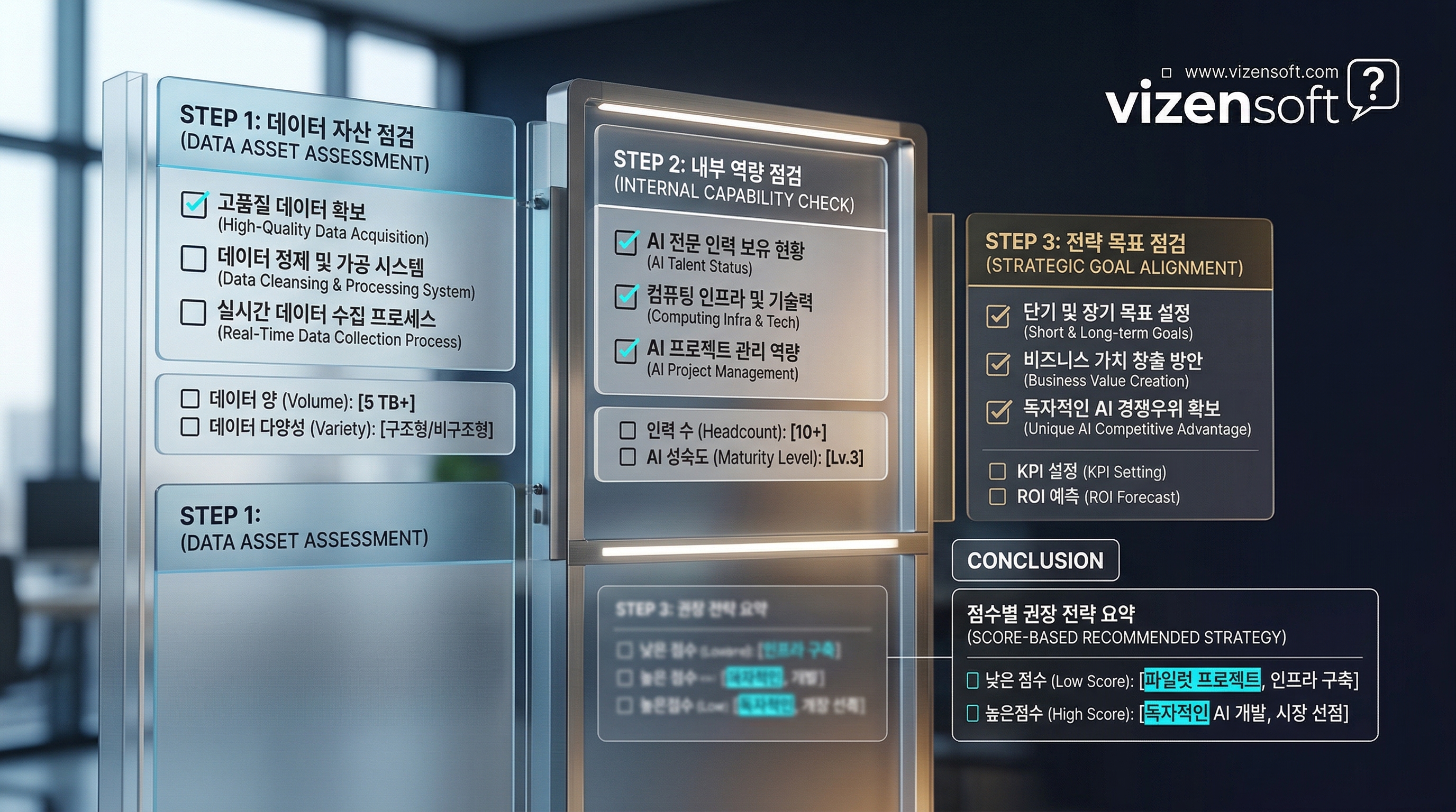 [Step 2] 내부 역량 점검 - [ ] AI/ML 전문 개발자가 내부에 있거나 채용이 가능한가? - [ ] AI 프로젝트 전담 예산이 5,000만 원 이상 확보되어 있는가? - [ ] 12개월 이상의 장기 프로젝트를 지속할 수 있는 조직 역량이 있는가?