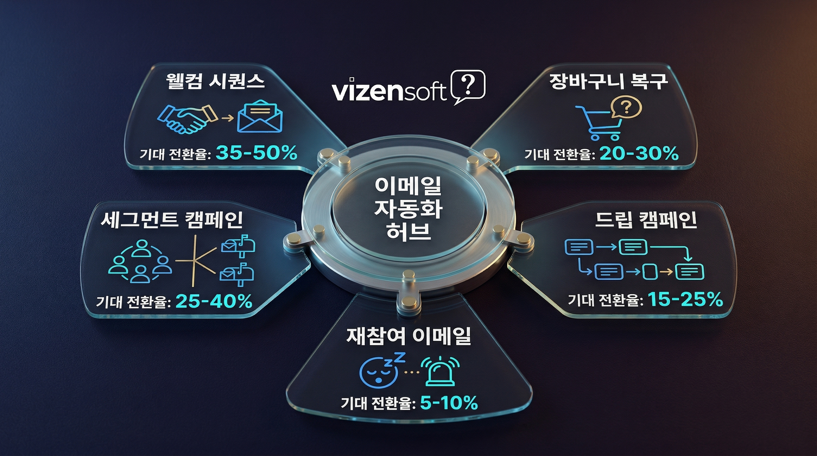 ① 웰컴 시퀀스(Welcome Sequence): 신규 가입 즉시 자동 발송되는 온보딩 이메일 시리즈. 첫 번째 이메일에서 브랜드 소개, 두 번째에서 주요 제품/서비스 안내, 세 번째에서 특별 혜택 제공 등 미리 설정된 시나리오대로 자동 발송됩니다.