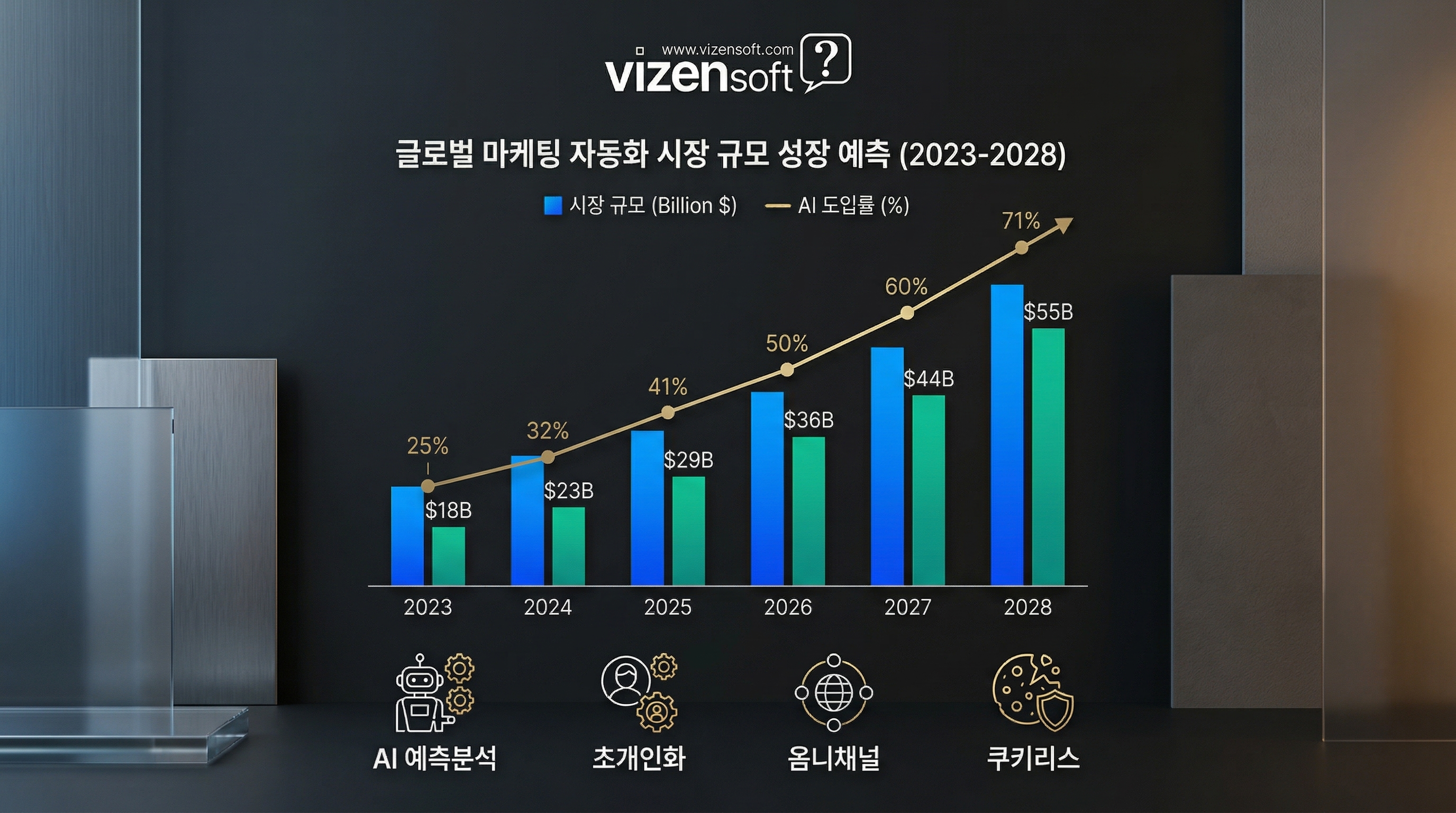 마케팅 자동화 시장은 2023년 약 56억 달러 규모에서 2028년까지 연평균 성장률(CAGR) 9.8%로 성장해 약 89억 달러 규모에 달할 것으로 예측됩니다(MarketsandMarkets, 2024). 이 성장의 배경에는 AI와 머신러닝 기술의 급격한 발전이 있습니다.