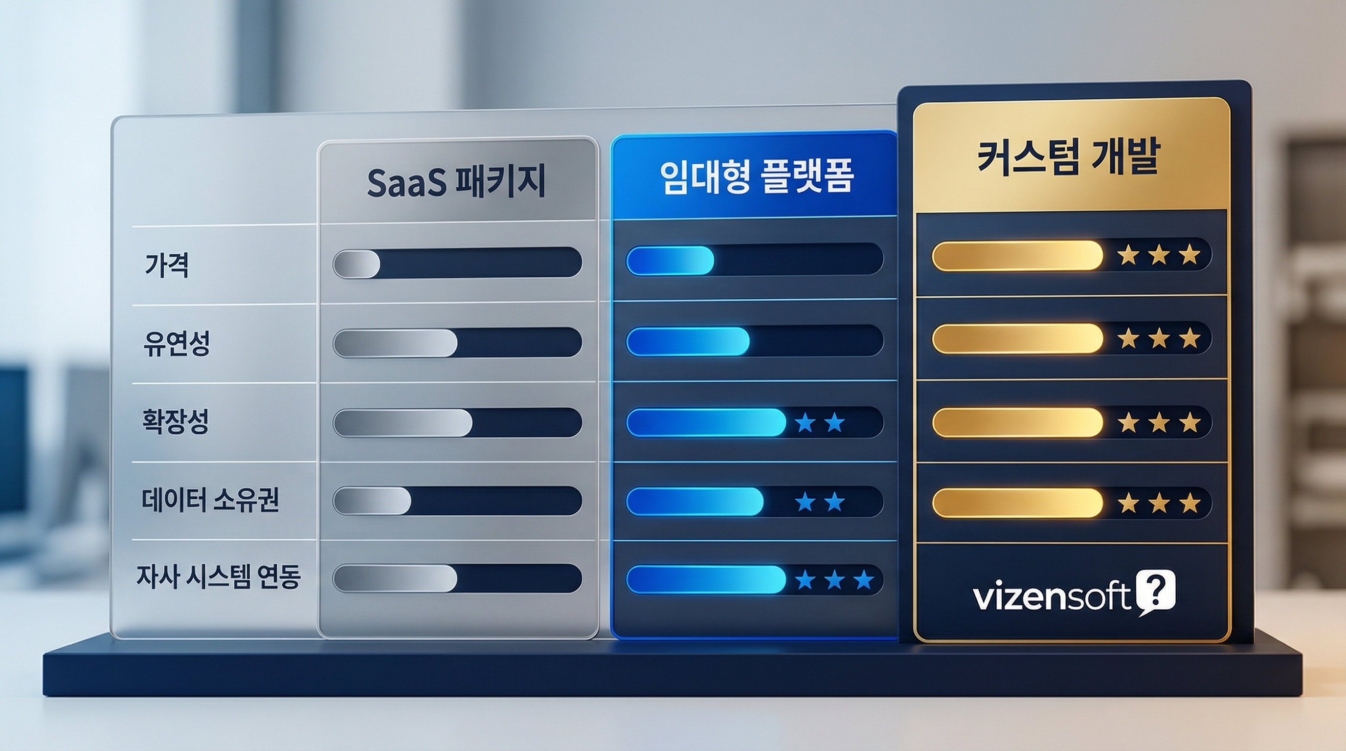 | 비교 항목 | SaaS 패키지 구독 | 임대형 통합 플랫폼 | 커스텀 개발 (비젠소프트) |