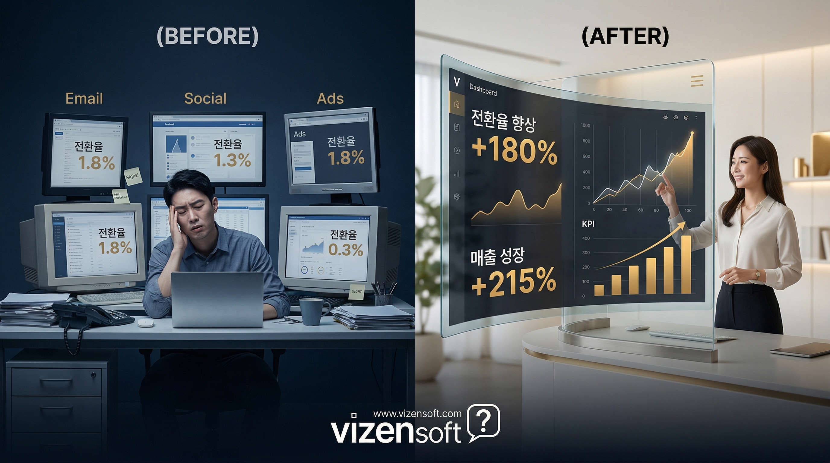 도입 전 상황: 월 광고비 2,000만 원을 집행 중이었지만 구매 전환율이 1.2%에 불과했고, 장바구니 이탈률이 78%에 달했습니다. 이메일은 월 1~2회 전체 발송으로 평균 오픈율 8%를 기록했습니다.
