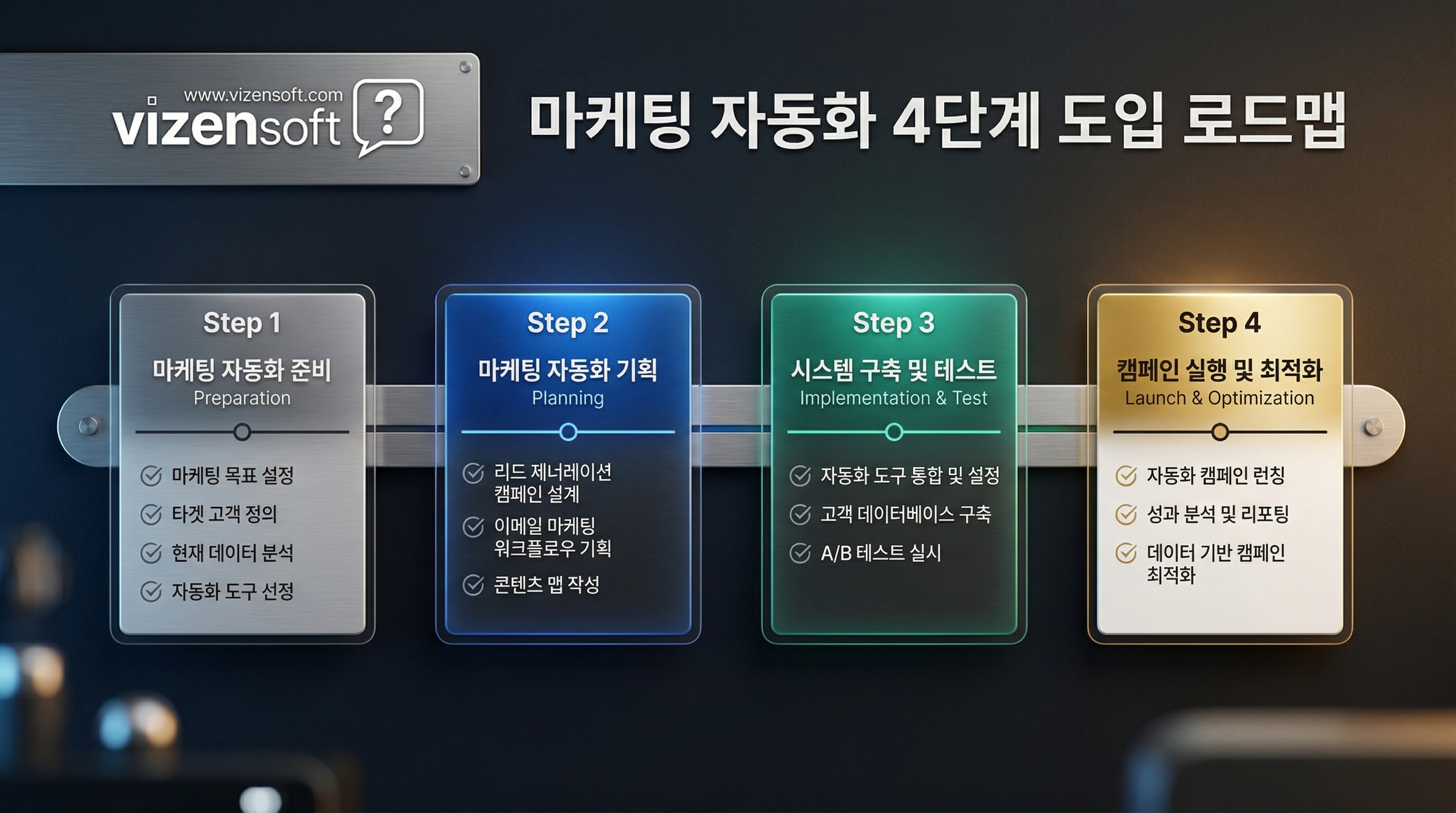 마케팅 자동화 시스템을 성공적으로 도입하기 위한 단계별 로드맵을 안내합니다. 처음부터 모든 것을 완벽하게 구축하려 하지 말고, 단계적으로 확장하는 방식이 가장 효과적입니다.