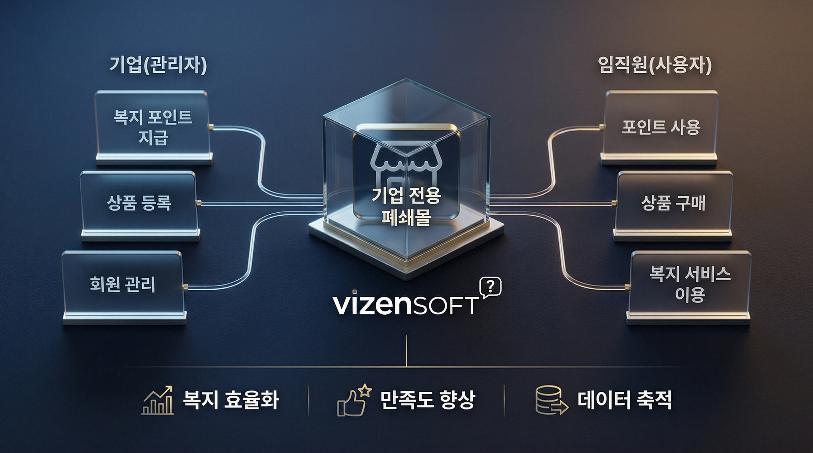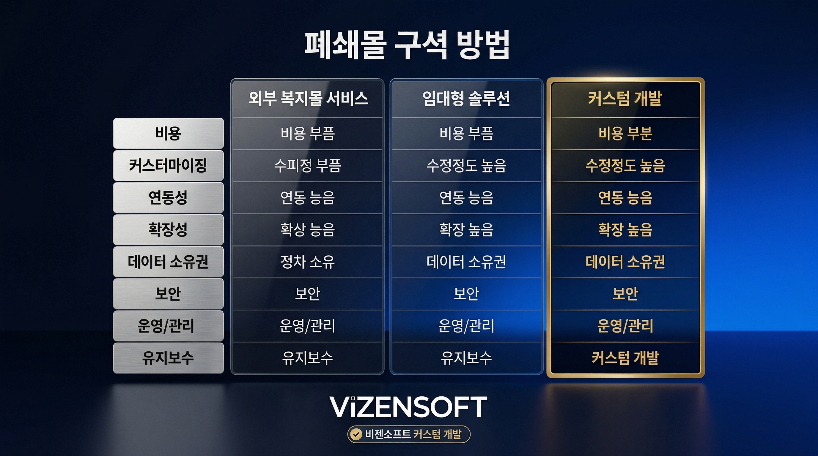 | 구분 | 외부 복지몰 서비스 | 임대형 솔루션 | 커스텀 개발 (비젠소프트) |
