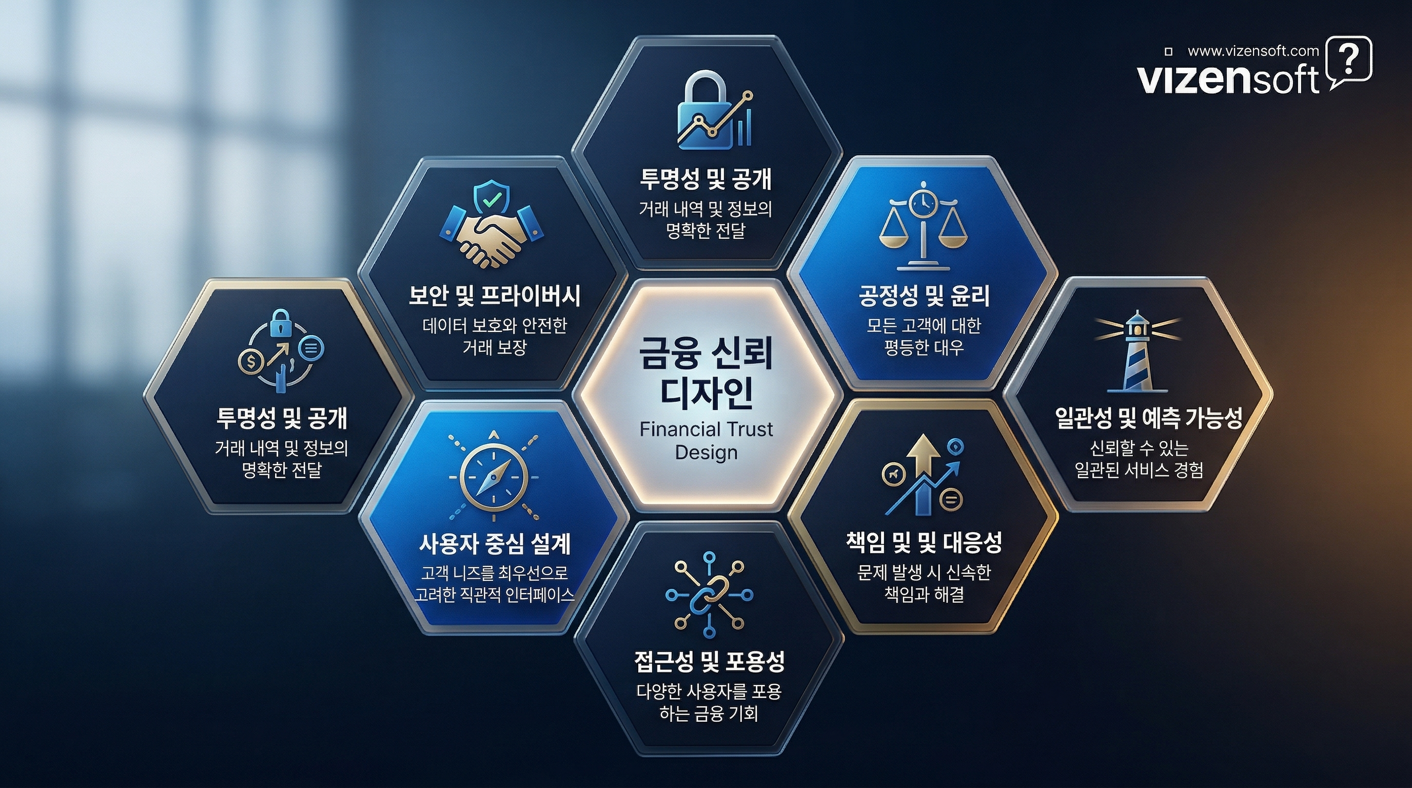 금융 서비스는 모든 연령대의 고객이 이용합니다. 웹 접근성 지침(WCAG 2.1 AA 기준)을 충족하는 디자인은 단순히 법적 의무(장애인차별금지법) 이행을 넘어, 신뢰할 수 있는 기관이라는 이미지를 강화합니다. 명암비 4.5:1 이상, 키보드 탐색 지원, 스크린리더 호환 등이 기본입니다.