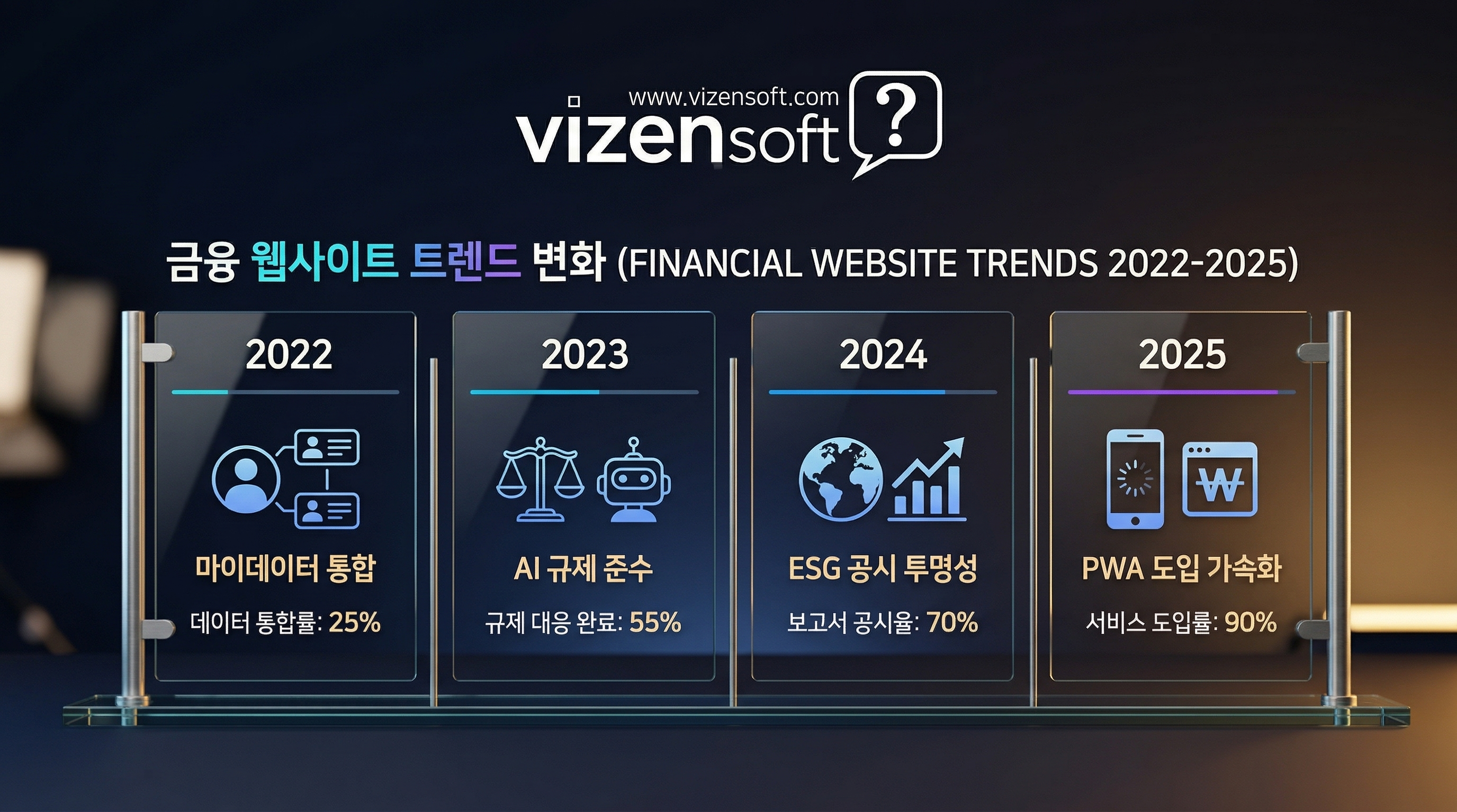 금융 웹사이트를 둘러싼 환경은 2024~2025년을 기점으로 급격히 변화하고 있습니다. 이 트렌드를 파악하지 못하면 지금 구축하는 홈페이지가 1~2년 내에 또 다시 대규모 리뉴얼을 해야 하는 상황이 발생합니다.