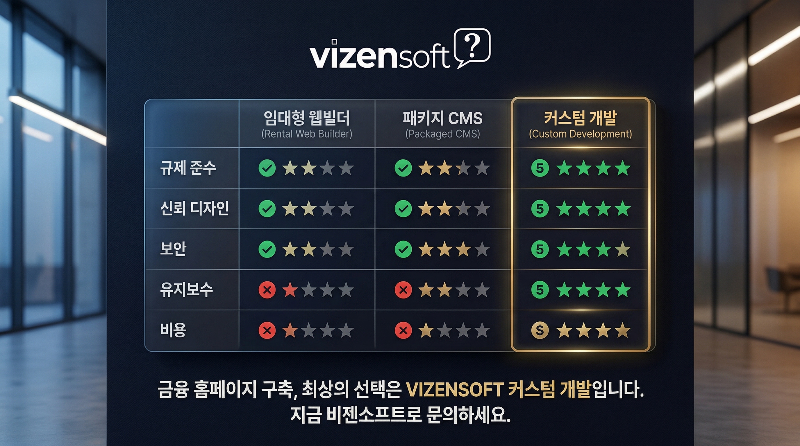 표에서 확인할 수 있듯이, 임대형 웹빌더와 패키지 CMS는 금융 규제의 복잡성과 신뢰 디자인의 정밀함 요건을 충족하기에 구조적 한계가 있습니다. 특히 금융소비자보호법이나 보험업법상 필수 고지의 위치와 형태를 법령 기준에 맞게 정확히 제어하려면, 템플릿에 기반한 솔루션으로는 한계에 부딪힐 수밖에 없습니다. 또한 임대형 플랫폼은 월 사용료가 누적되면서 5년 기준 총 비용이 커스텀 개발보다 오히려 높아지는 경우가 많습니다. 처음부터 커스텀으로 구축하는 것이 규제 준수, 신뢰 구축, 장기 비용 효율 모든 면에서 금융기관에 최적의 선택입니다.