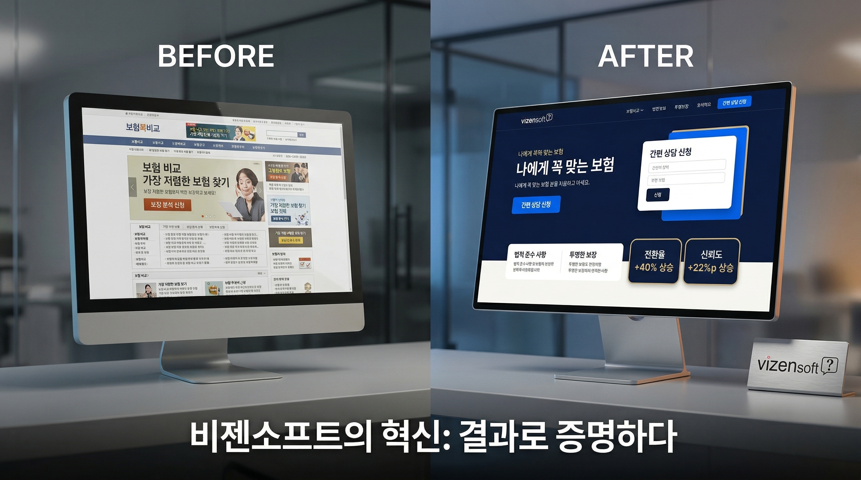 커스텀 개발 기반 리뉴얼 후 결과 (6개월): - 금감원 후속 검사에서 규제 준수 전 항목 충족 확인 - 보험 가입 전환율 1.2% → 1.68%로 40% 향상 - 평균 페이지 로딩 속도 5.8초 → 1.9초로 67% 개선 - 고객 신뢰도 설문조사 결과 '신뢰할 수 있다' 응답 62% → 84%로 상승 - 모바일 전환율 별도 측정 시 PC 대비 82% 수준으로 개선 (기존 41%) - AI 챗봇 도입 후 고객 서비스 문의 처리 시간 평균 73% 단축