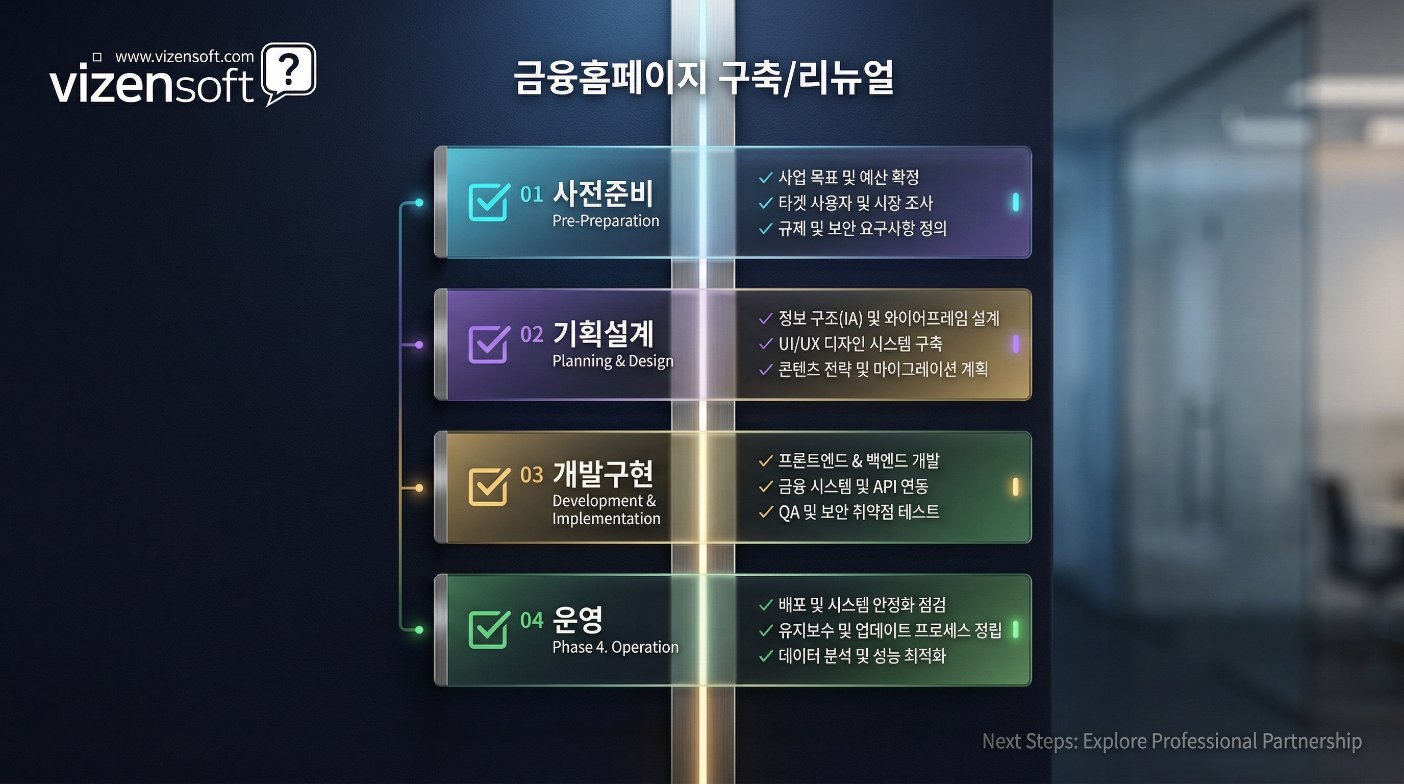 지금 당장 여러분의 금융홈페이지를 점검하거나 새로 구축을 시작한다면, 이 체크리스트를 기준으로 활용하세요. 단계별로 빠짐없이 확인하면 규제 미흡으로 인한 리스크를 최소화할 수 있습니다.