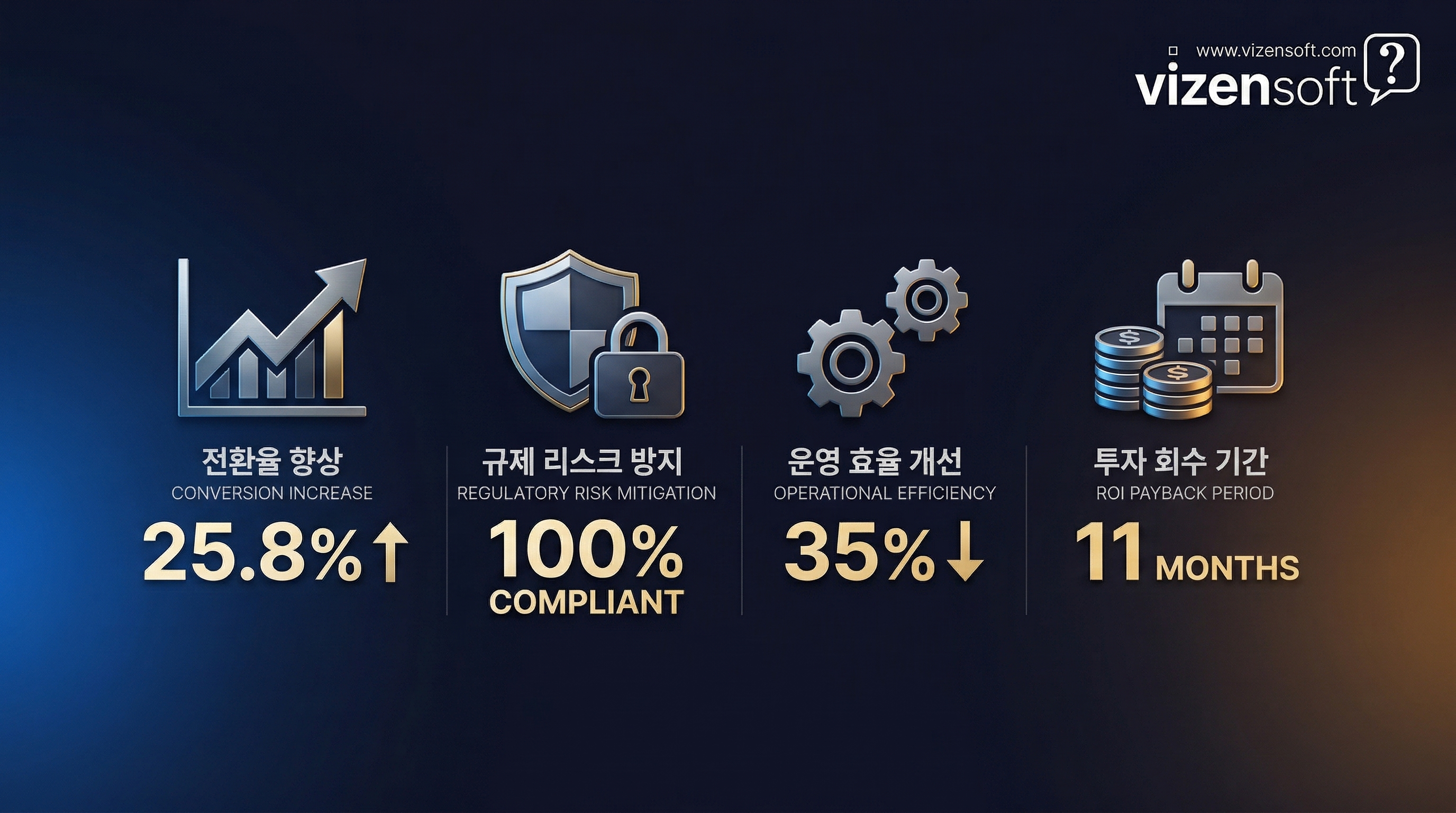 투자 회수 기간 추정: 커스텀 개발에 3,000만 원을 투자하고 전환율이 30% 개선된 금융상품 회사의 경우, 상품 1건당 수수료 또는 보험료가 월 30만 원이라면 월 추가 수익 기준 약 12~18개월 내 투자 회수가 가능한 수준입니다. 여기에 규제 리스크 방지 효과를 금액으로 환산하면 실질 ROI는 더욱 압도적입니다.