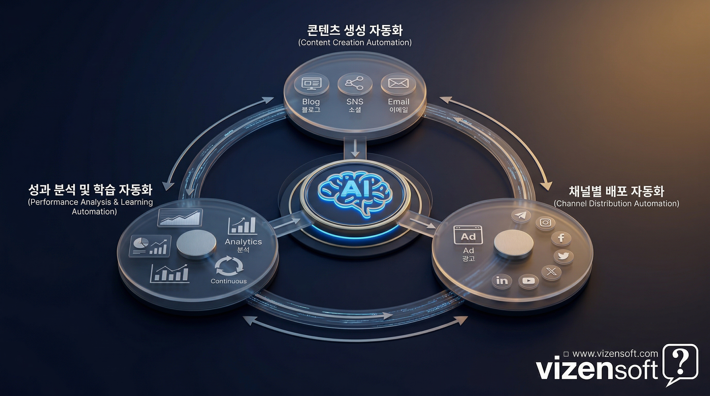 핵심 구성 요소는 크게 세 가지로 나뉩니다. 첫째는 콘텐츠 생성 자동화입니다. AI가 브랜드 톤앤매너를 학습한 뒤, 블로그 포스트, SNS 캡션, 이메일 뉴스레터, 광고 카피 등을 자동으로 생성합니다. 단순히 텍스트를 뽑아내는 것이 아니라 SEO 키워드를 분석하고, 타겟 오디언스의 관심사에 맞게 메시지를 최적화합니다. 둘째는 채널별 배포 자동화입니다. 생성된 콘텐츠를 어느 채널에, 어느 시간에, 어떤 형식으로 발행할지를 AI가 판단해 자동 실행합니다. 셋째는 성과 분석 및 학습 자동화입니다. 발행된 콘텐츠와 광고의 성과 데이터를 실시간으로 수집, 분석하고 다음 액션에 반영합니다.