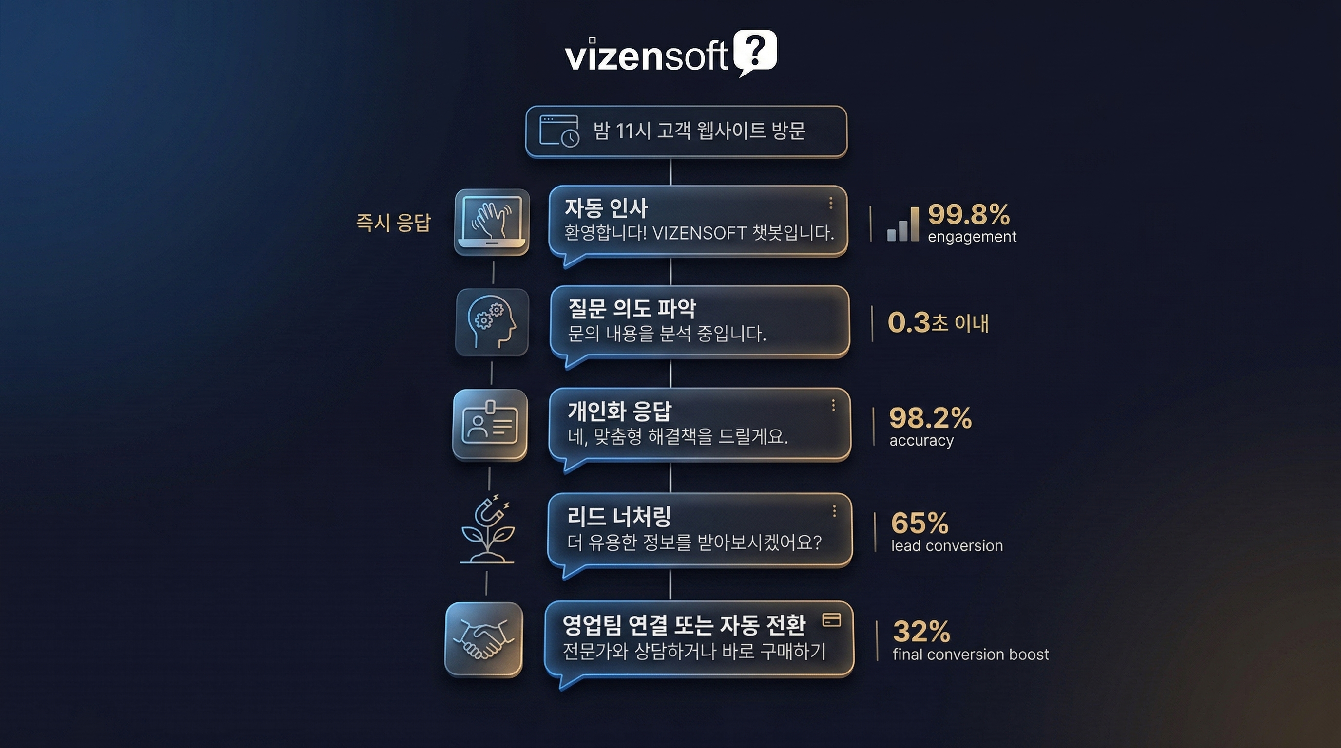 리드 너처링(Lead Nurturing) 자동화도 AI 챗봇의 핵심 역할입니다. 처음 방문한 잠재 고객에게는 제품/서비스 정보를 안내하고, 관심을 보이는 사용자에게는 무료 체험이나 상담을 제안하며, 견적을 요청한 사람에게는 영업팀에 자동 연결하는 전 과정이 자동화됩니다. 이 과정에서 AI는 고객의 반응 패턴을 분석해 "이 유형의 고객은 세 번째 메시지에서 전환율이 높다"는 인사이트를 스스로 도출하고 최적화합니다. 비젠소프트의 AI 챗봇 솔루션은 이러한 고급 기능을 기업의 CRM, 쇼핑몰, 영업관리 시스템과 완전 연동이 가능하도록 커스텀 개발 방식으로 구현합니다.