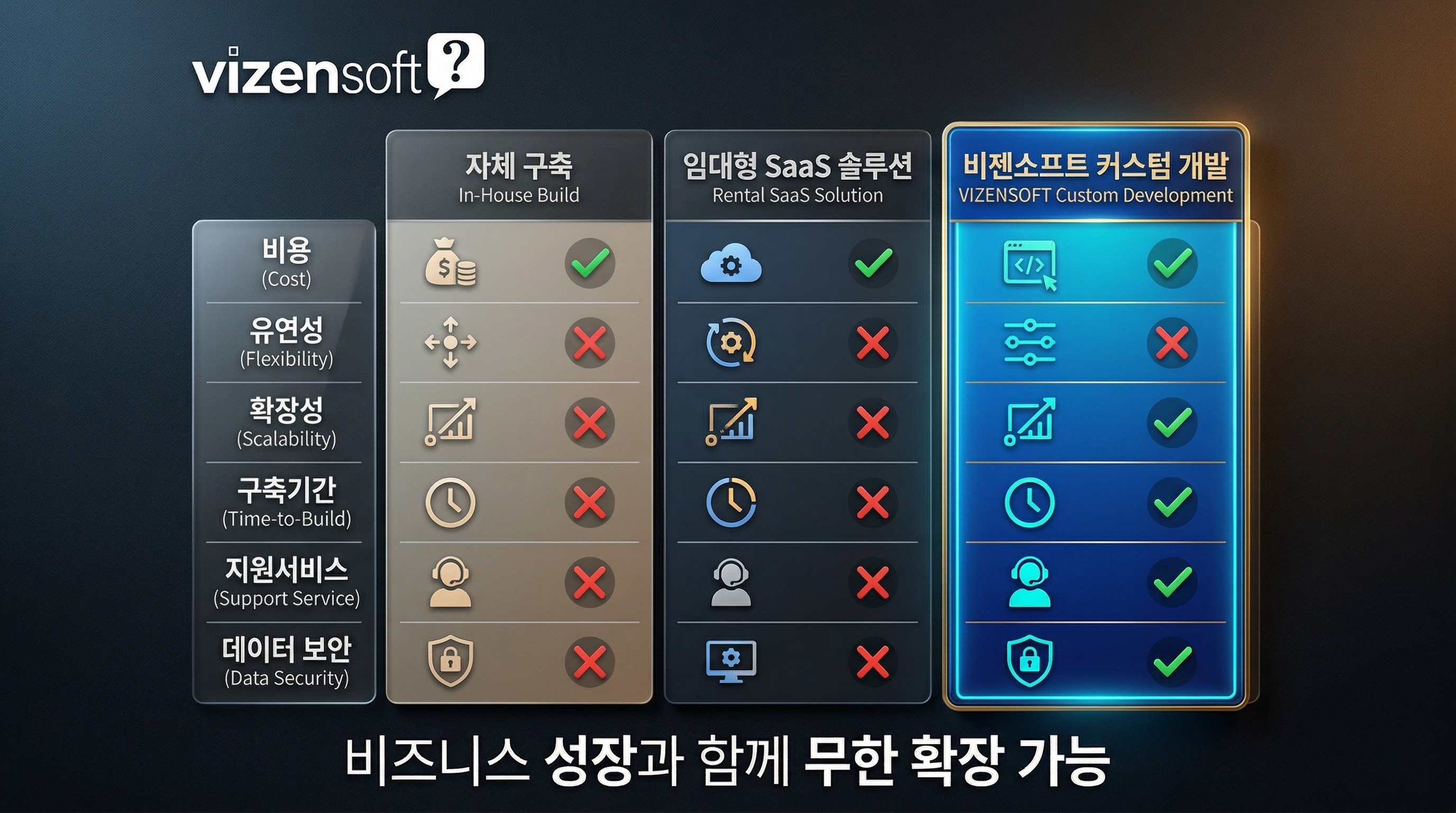 | 구분 | 자체 구축 (오픈소스) | 임대형 SaaS 솔루션 | 비젠소프트 커스텀 개발 |