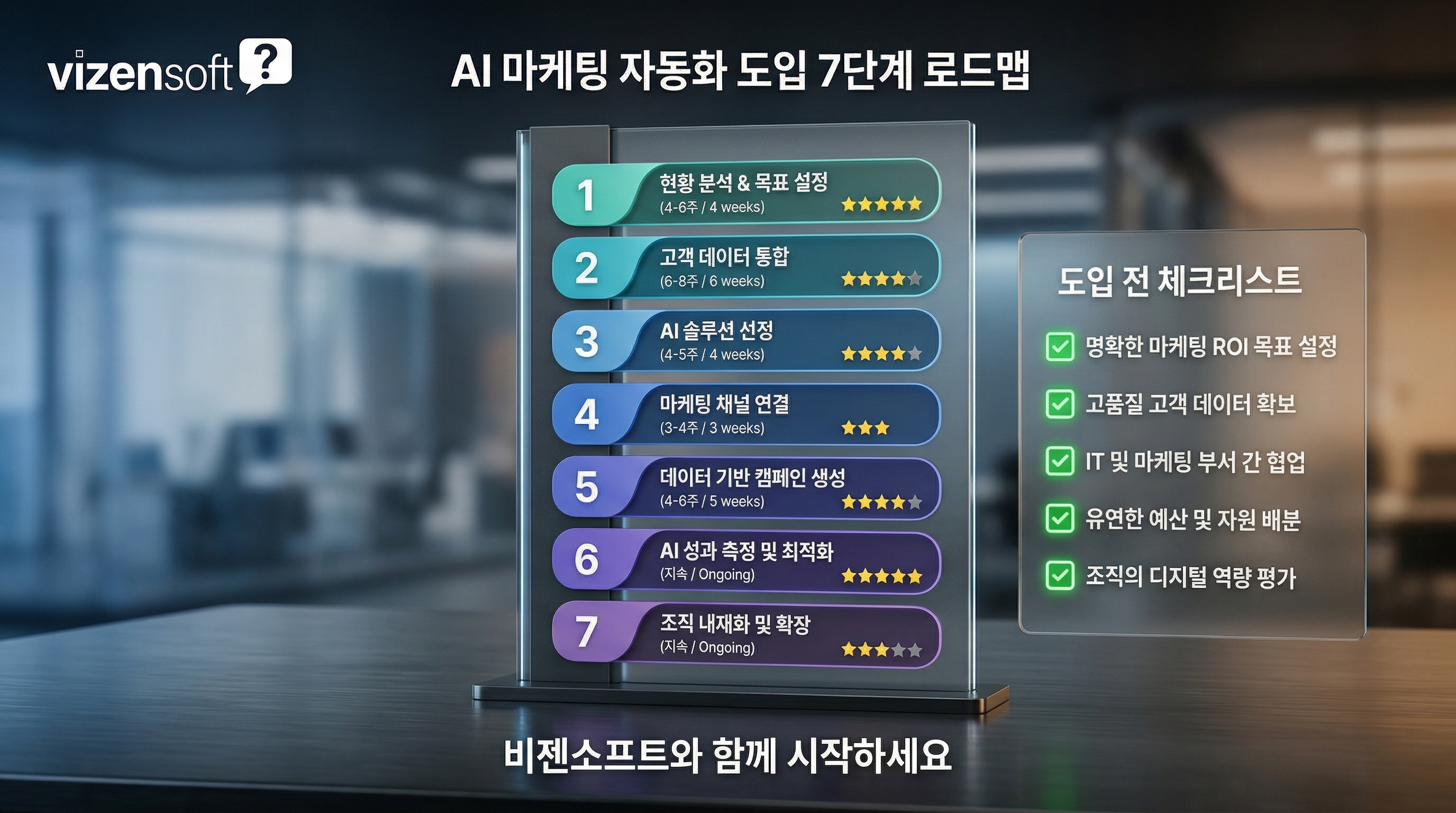AI 마케팅 자동화를 처음 도입하려는 분들이 가장 많이 하는 실수는 "모든 것을 한 번에 자동화하려는 것"입니다. 단계별 접근이 성공의 핵심입니다. 아래 가이드를 따라 체계적으로 시작하세요.