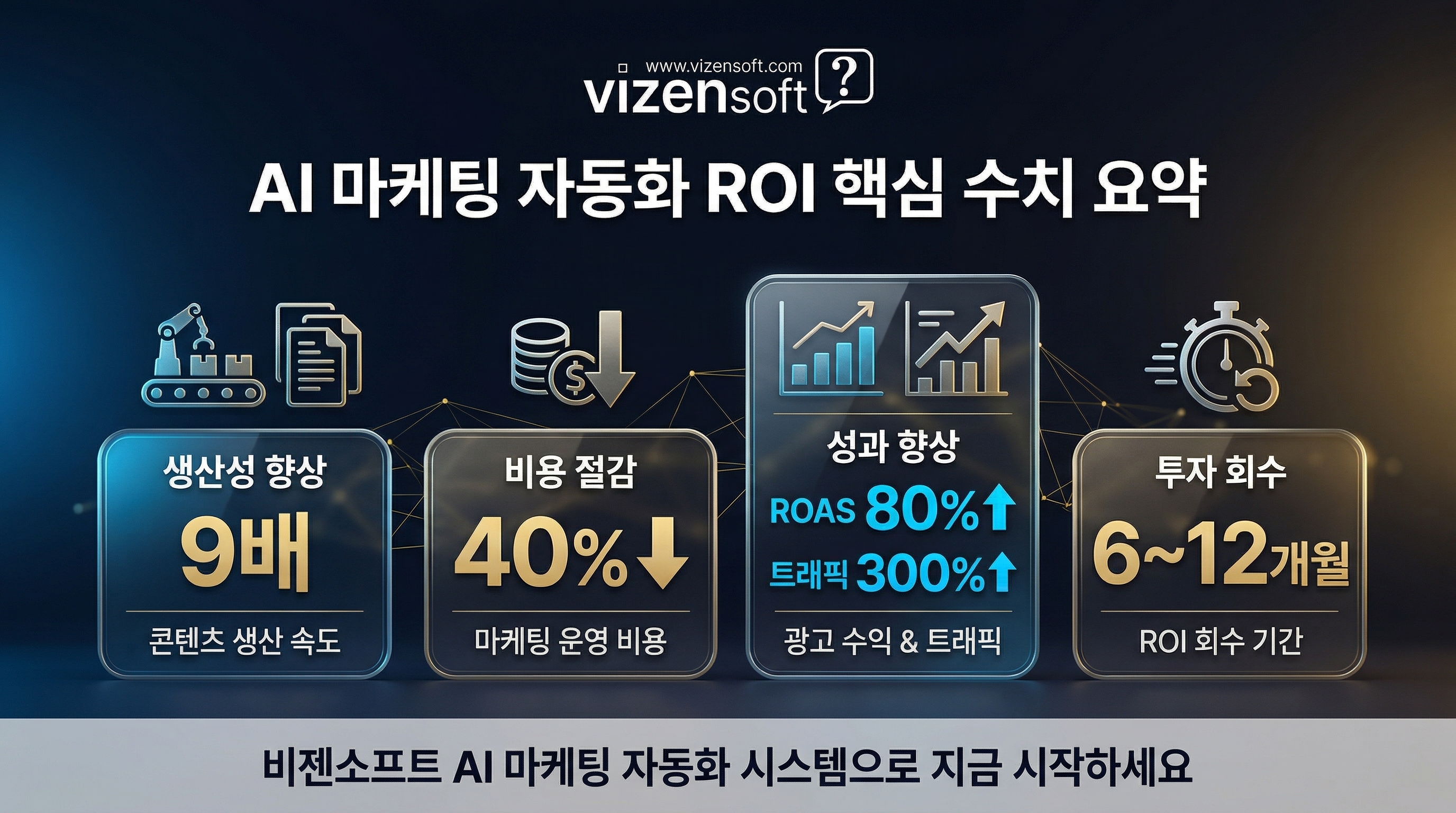 💰 비용 지표: 광고 운영 비용(에이전시 수수료, 내부 인건비 포함) 평균 25~40% 절감, 콘텐츠 제작 단가 60~80% 감소, 고객 응대 비용 30% 절감. 중소기업 기준 연간 마케팅 비용 절감액이 2,000만~8,000만 원에 달하는 사례도 있습니다.